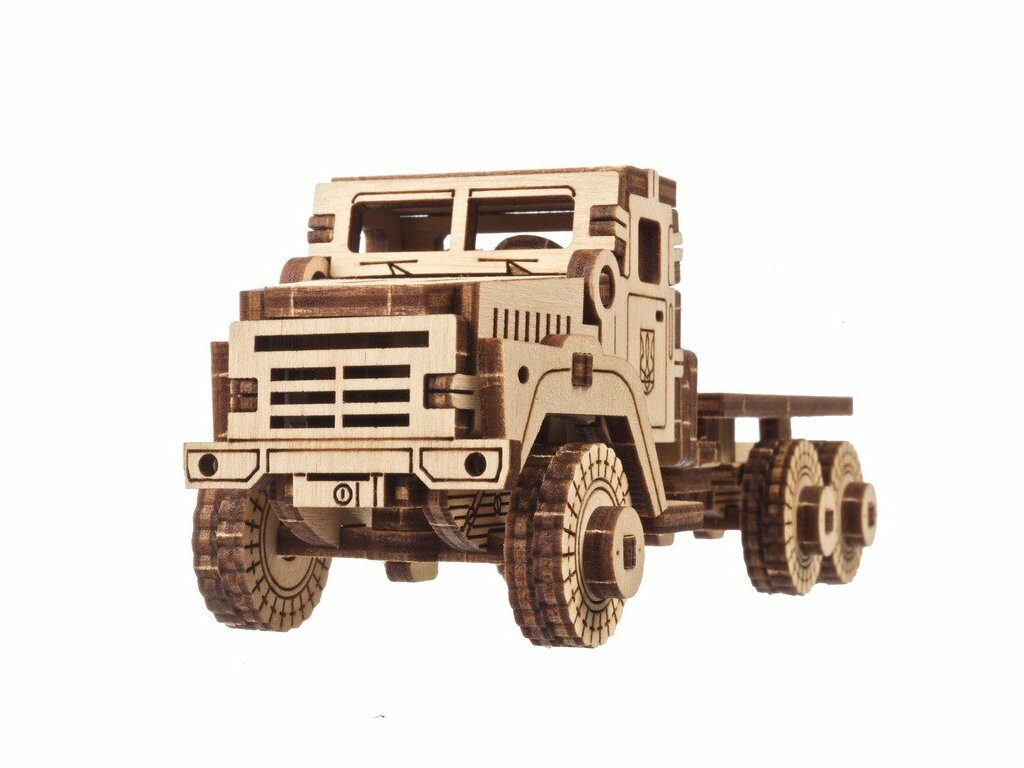 Tento odolný, třínápravový, vojenský nákladní vůz je postavený pro frontovou službu na silnici i v terénu v nejnáročnějších podmínkách sněhu, ledu a bláta. Ať už jde o tažení dělostřeleckých děl, odstraňování trosek nebo vybavení pro přepravu vojsk, toto nákladní vozidlo odvede svou práci skvěle. Náš dřevěný model má otáčecí kola, kapotu, která se otevírá, a na kabině je namontovaná rezervní pneumatika a nádoba na palivo. Laserem gravírované detaily zahrnují trojzubec na dveřích kabiny, národní symbol ukrajinské síly, svobody a nezdolného ducha. Tento mini model obsahuje 91 kusů, laserem předem vyřezaných do kompozitních dřevěných desek což z něj dělá lehce náročnou stavbu vhodnou pro začátečníky. Smontované rozměry hotového dřevěného modelu jsou 125 x 61 x 48 mm. Dokončené 3D puzzle můžete ponechat v atraktivním stavu přírodního dřeva nebo natřít kamuflážním, vojenským či jiným barevným schématem dle vašeho výběru. Modelová sada obsahuje ilustrované pokyny krok za krokem v 11 jazycích a kousek vosku na mazání pohyblivých částí. K montáži není potřeba žádné lepidlo ani speciální nářadí, stačí jednotlivé díly zaklapnout. Hlavní vlastnosti: 91 precizně vyřezaných dílkůjednoduchá obtížnost sestavenívýsledný model je řiditelný a schopný samostatné jízdynavrženo a vyrobeno na Ukrajině