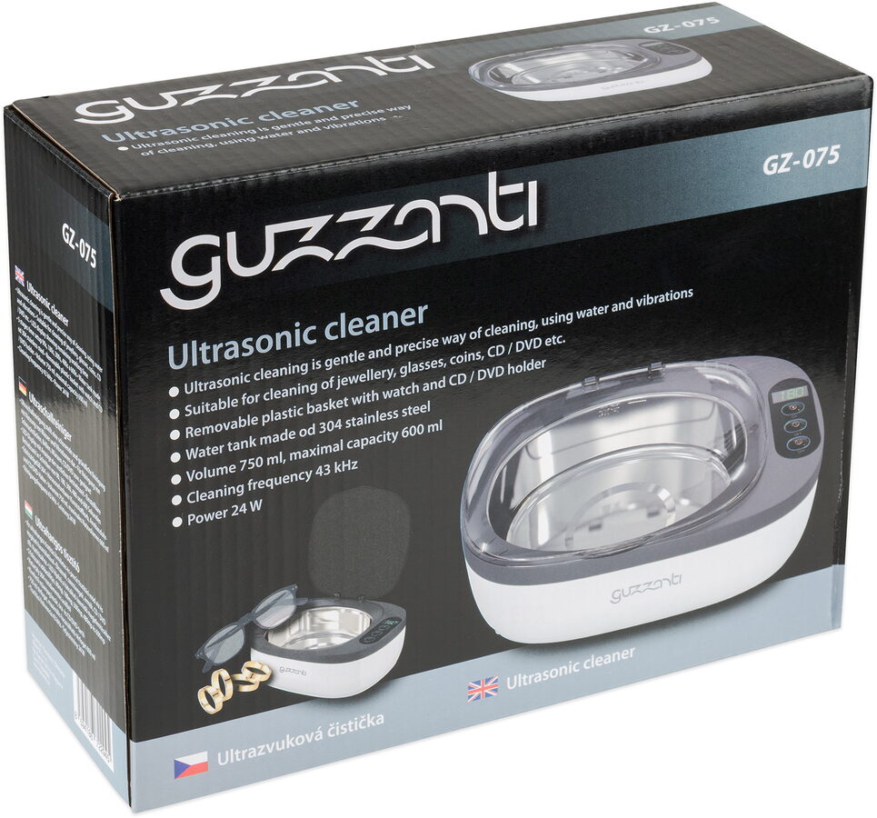 Vnitřní nádrž z nerezové oceli třídy 304 má objem cca 750 ml, ale maximálně lze využít 600 ml vody, aby byla zachována efektivita čištění. Přibalený plastový košík, držák na hodinky a CD/DVD usnadňuje uspořádání čištěných předmětů a chrání zařízení i obsah.