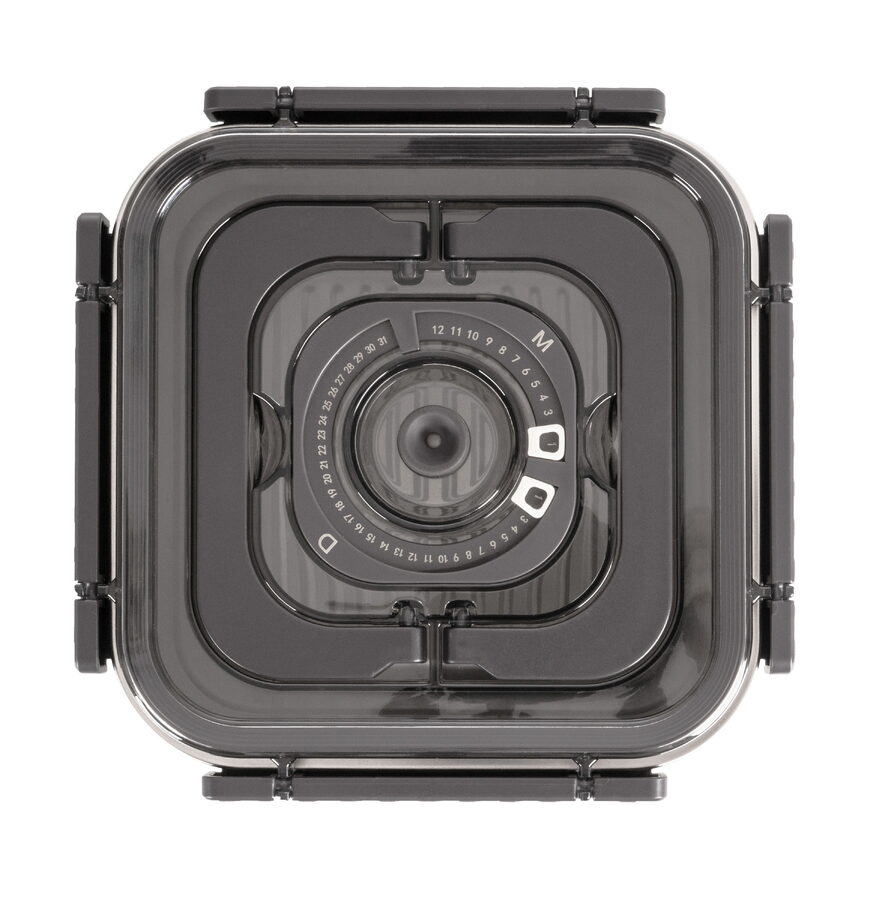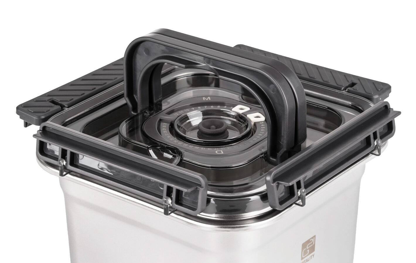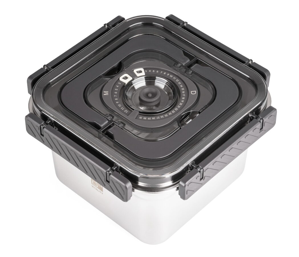 Víko z BPA Free plastu je vybavené vakuovacím ventilem a praktickým nastavitelným ukazatelem data. Budete tak vědět, kdy byly potraviny vakuovány nebo do kdy se mají spotřebovat. Pro uvolnění vakua a otevření dózy stačí jemně zmáčknout ventil uprostřed víka.