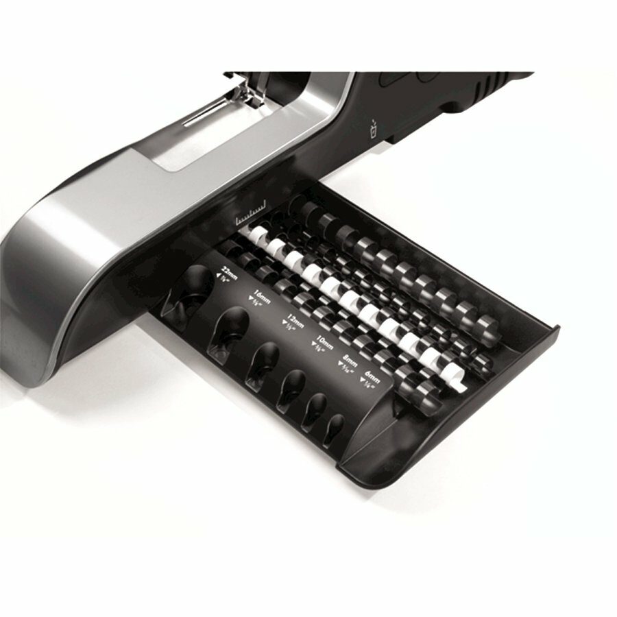 Široký půdorys stroje zajišťuje jeho dobrou stabilitu na pracovním stole i při děrování maximálního počtu listů. Přístroj je vybavený větším zásobníkem na uložení několika plastových hřbetů a integrovanou měrkou pro správnou volbu průměru hřbetu.