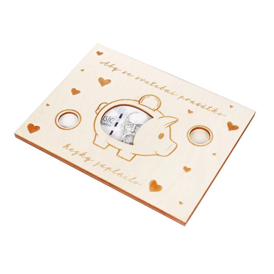 Darujte novomanželům peníze v dárkové dřevěné kapse v tématickém tvaru.