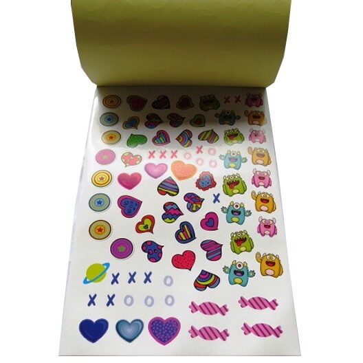Velká kniha samolepek – obsahuje 9 archů různých samolepek – malé, velké smajlíky, duhy, hvězdičky, metalické, holografické, různě barevné. Samolepky jsou vyřezány na stránce pro snadné odlepení.