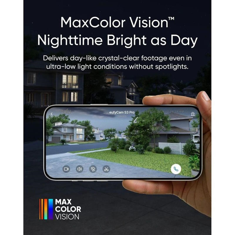 EufyCam S3 Pro je vybavena kamerami ve 4K kvalitě s technologií MaxColor Vision, díky které získáte jasné záběry s důrazem na nejmenší detaily, i za špatných viditelných podmínek. Díky tomu není potřeba instalace dodatečného osvětlení.
