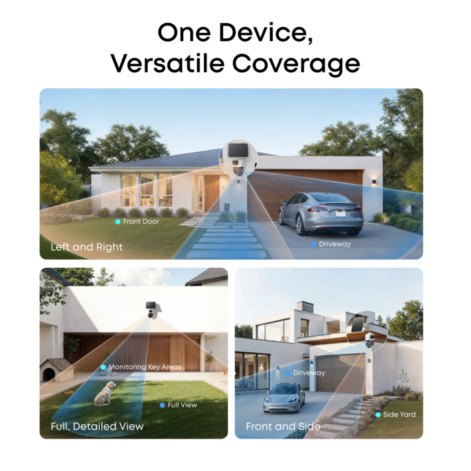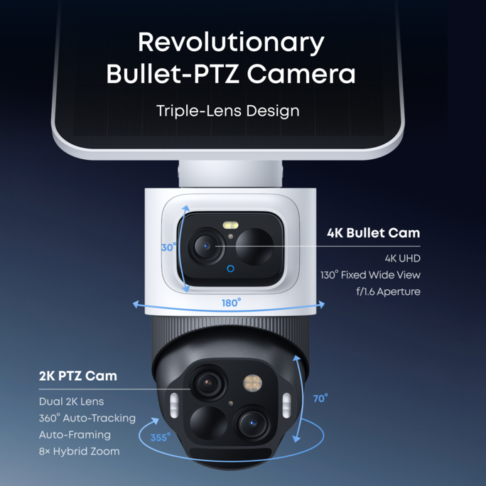 Kombinovaný design: Každá kamera má 4K bullet kameru se 130° zorným úhlem a 2K PTZ modul s možností otáčení o 360° a náklonu až 70°, umožňující detailní sledování a zoom až na 50 metrů.