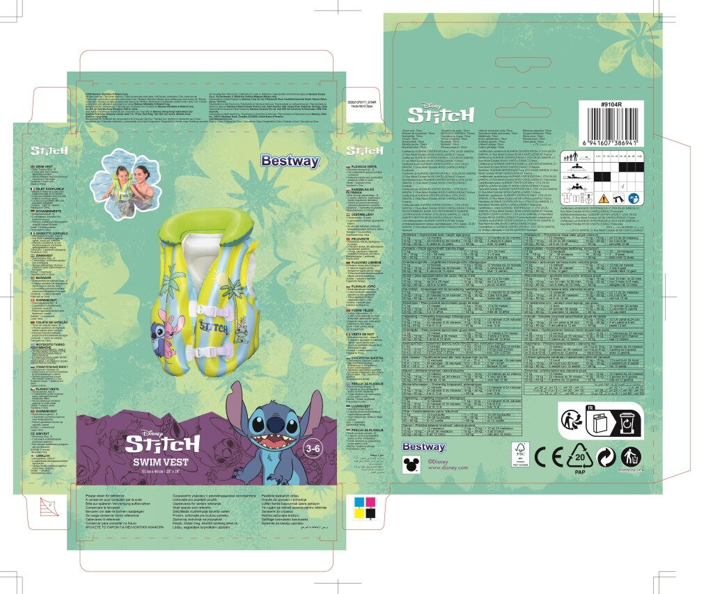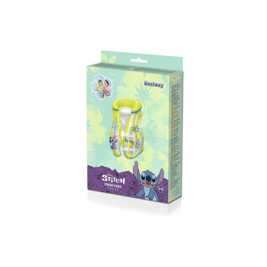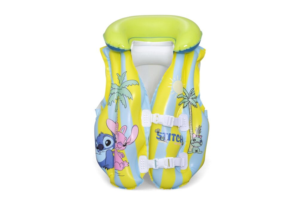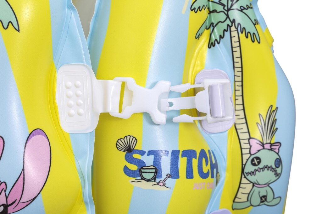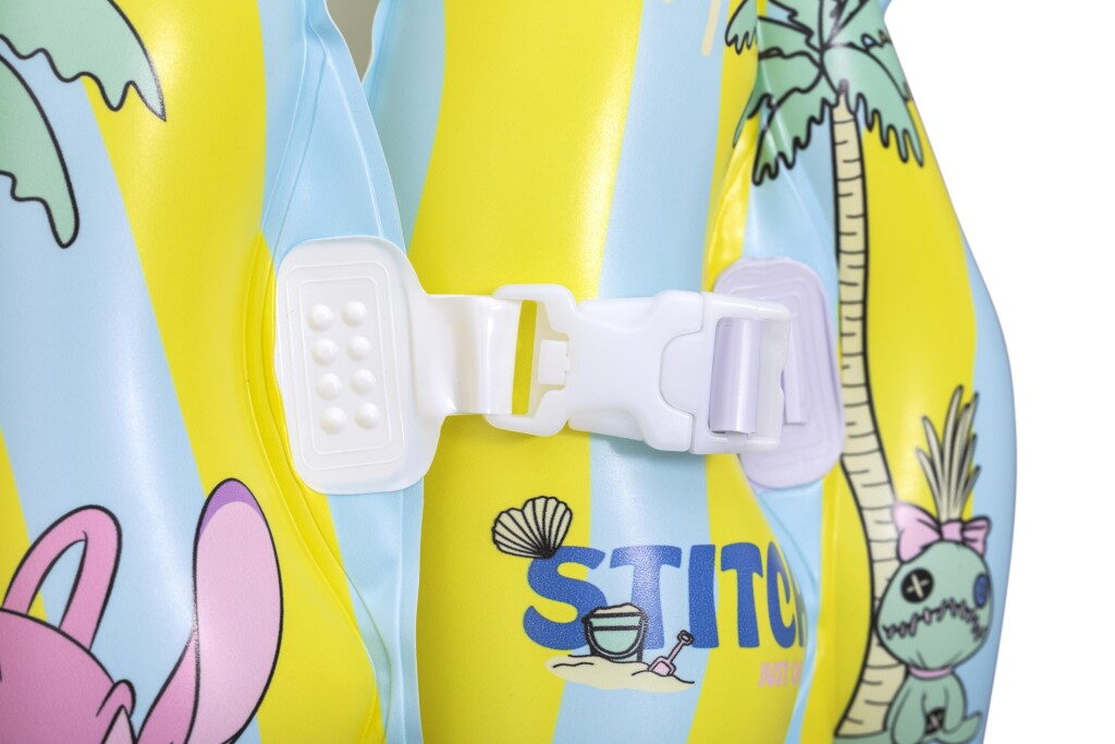 Dětská nafukovací plavací vesta ve veselém designu Stitche pro bezpečnost dětí s pohodlným límcem a dvěma nastavitelnými přezkami. Doporučeno pro děti ve věku 3–6 let. Velikost nafouknuté vesty je 45cmx33×16 cm.