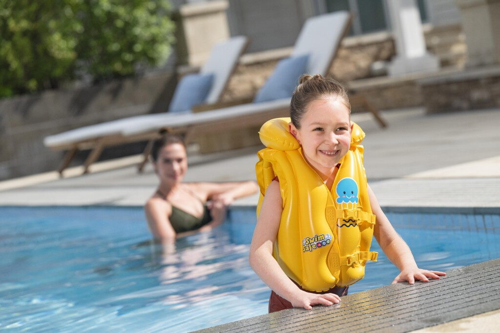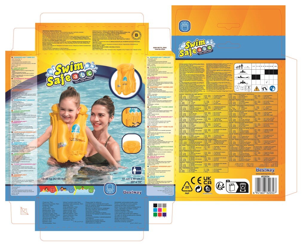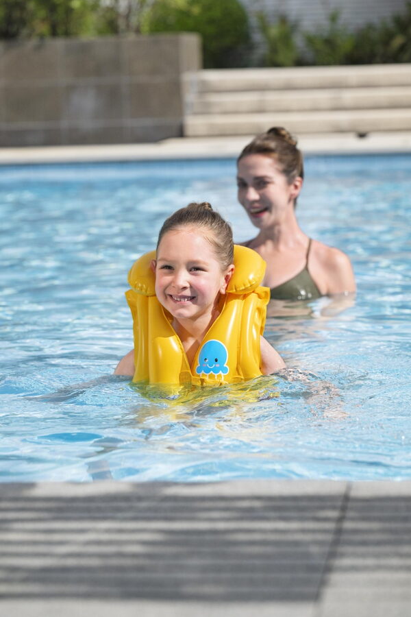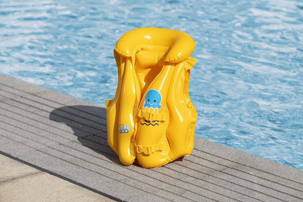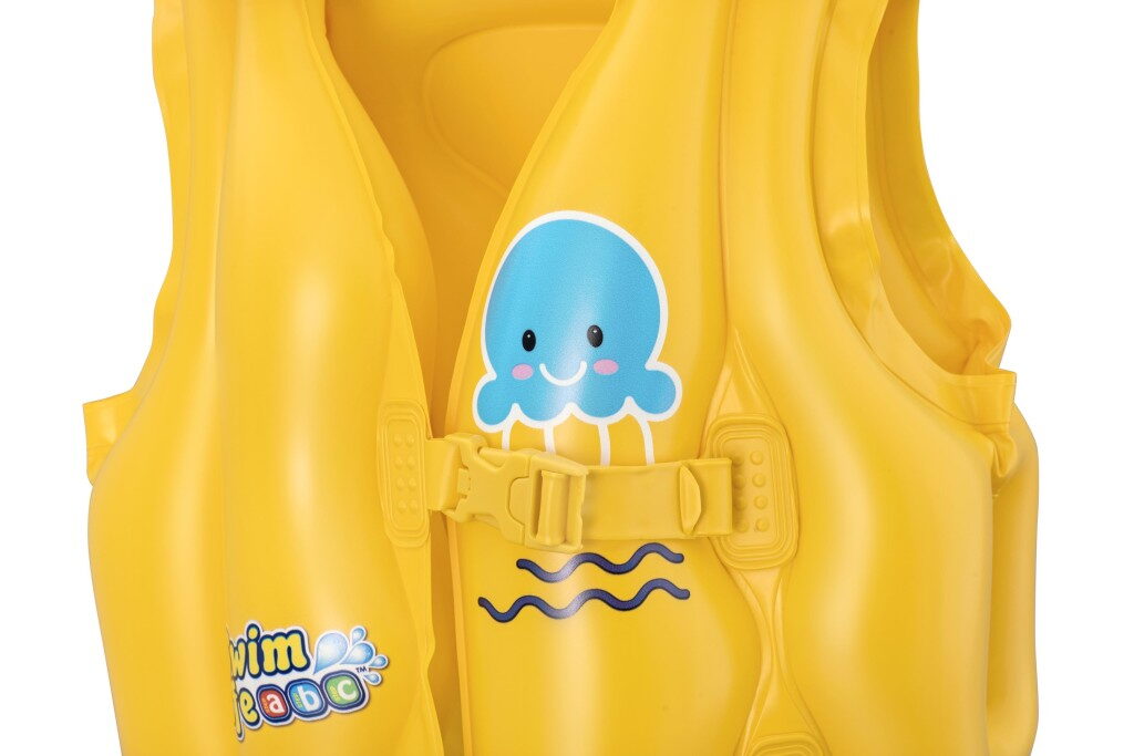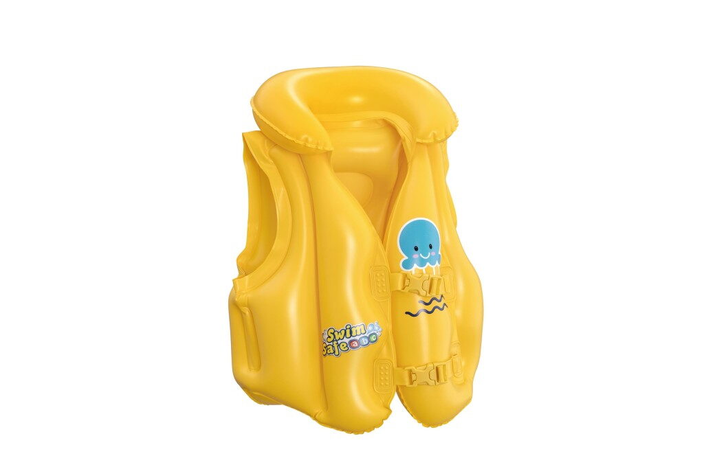 Nafukovací vesta pro děti od 3 do 6 let o velikosti 51×46 cm. 3 vzduchové komory, nafukovací límec, dvě nastavitelné přezky.