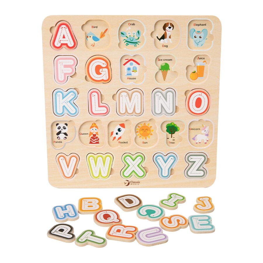 Vzdělávací hra, díky které se děti zábavnou formou učí poznávat písmenka, skládat slovíčka nebo celé věty. Dřevěné dílky vyřezávaných puzzlí s písmenky musí dítko umístit do správného otvoru. Učíme tak jemnou motoriku ruky a prostorovou představivostu dětí. Navíc dítě objevuje první základy angličtiny, pod písmenkem se vždy schovává obrázek v angličtině.