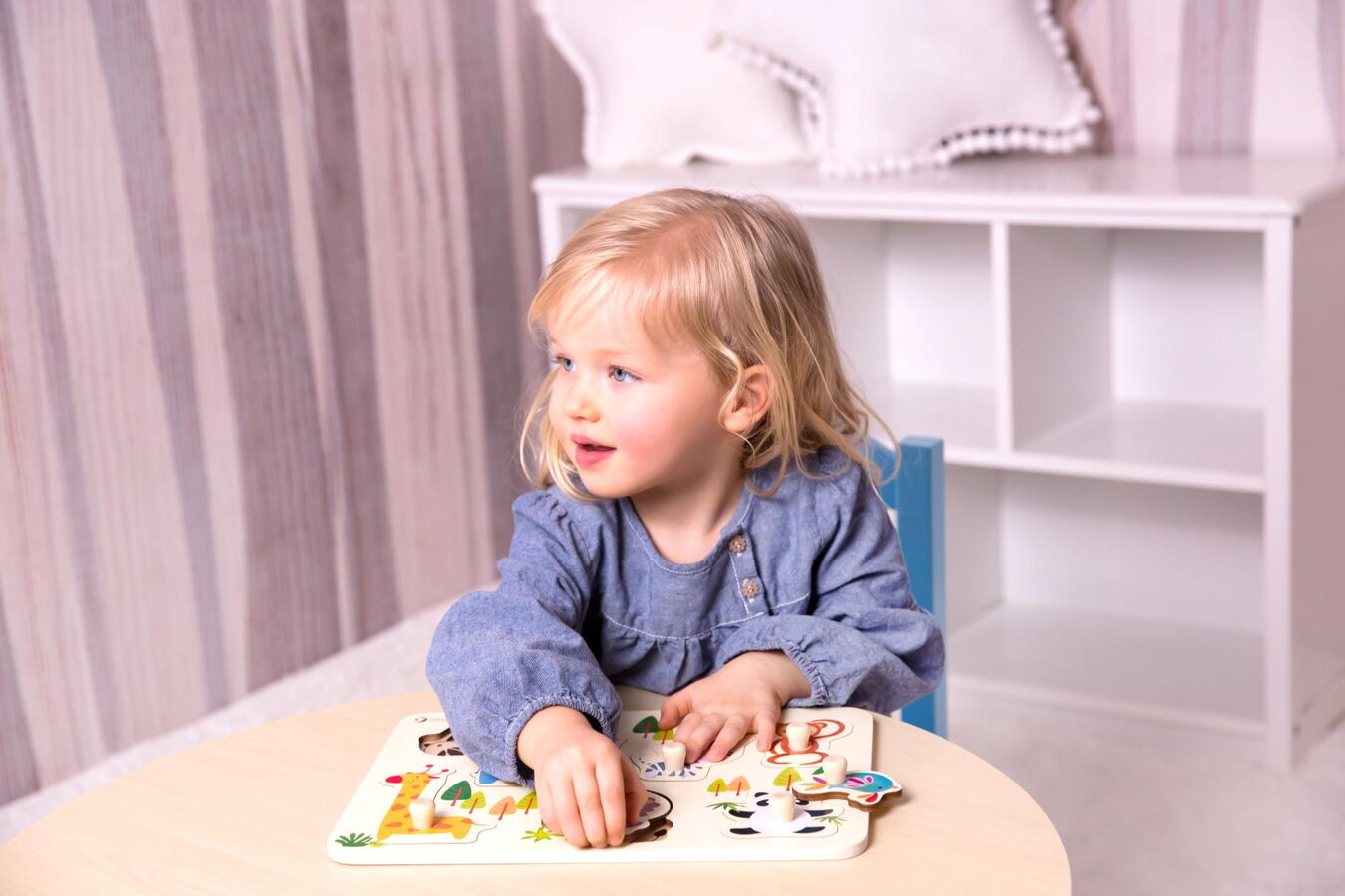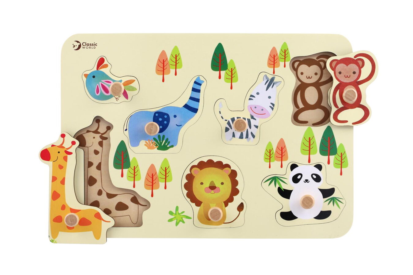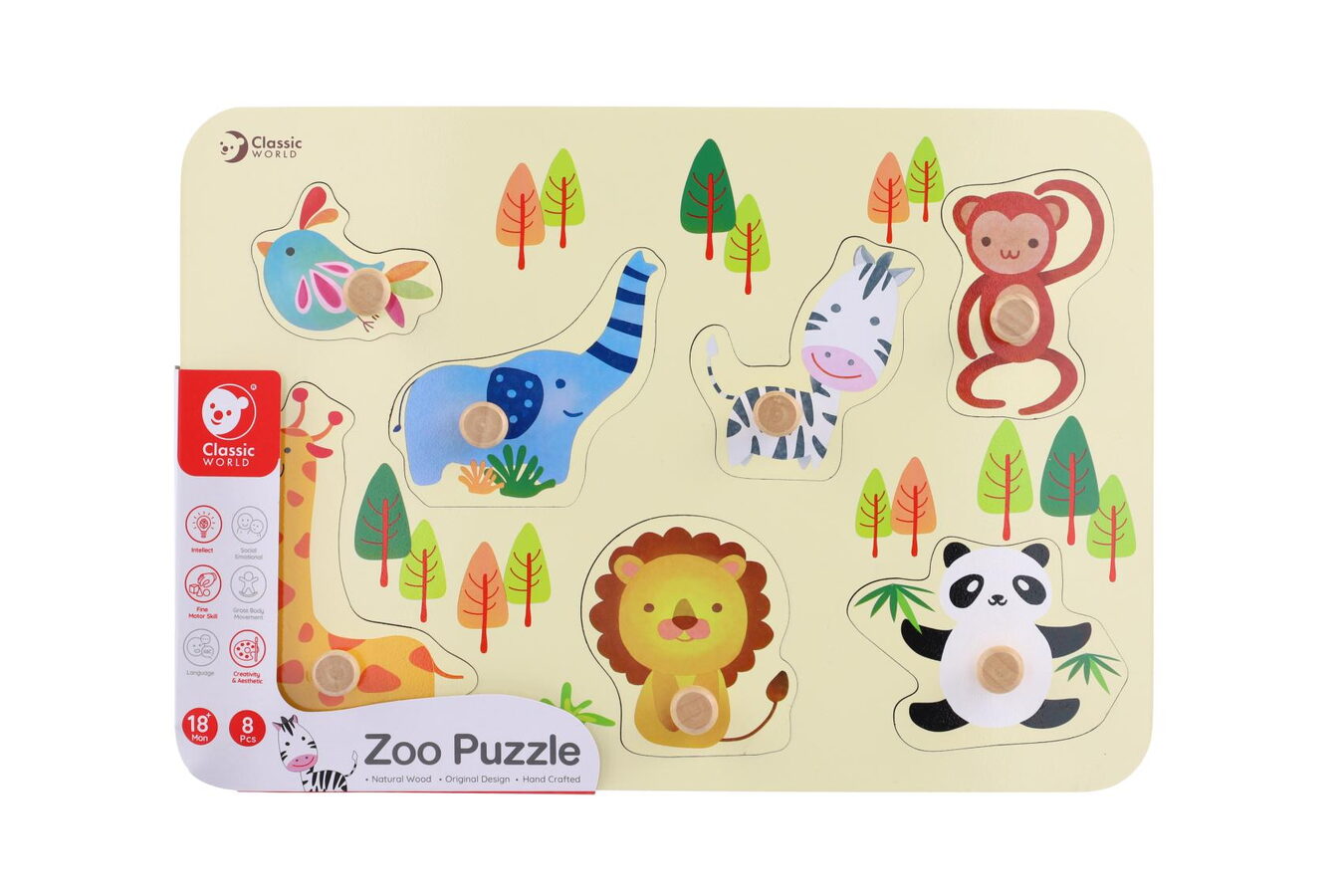 Naučte své dítko rozeznávat zvířátka v ZOO už od kolébky. S dřevěnou vkládací destičkou si nejvíc vyhrají prckové od 18 měsíců, spolehlivě ale zaujme i mladší zvědavce. Umisťováním zvířátek do správných otvorů (ale i jejich vyhazováním, strkáním do pusy či schováváním na nejtajnější místa) si děti procvičí motoriku, fantazii a rozlišovací schopnosti. Kvalitní dřevo pro vkládačku je precizně opracováno tak, aby dítěti nehrozilo poranění ani při divočejším zacházení. Vkládačka obsahuje 8 dílů včetně destičky.