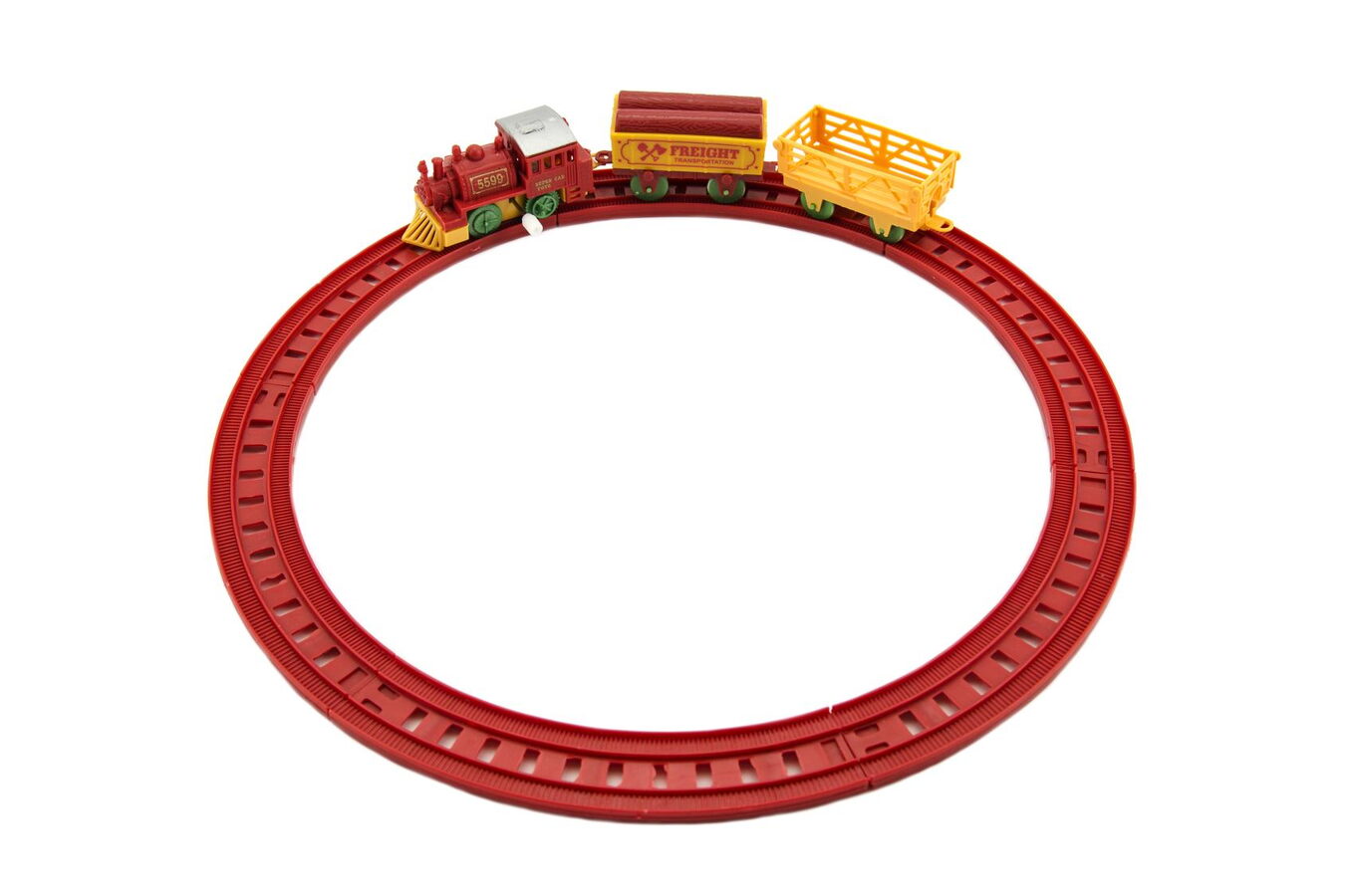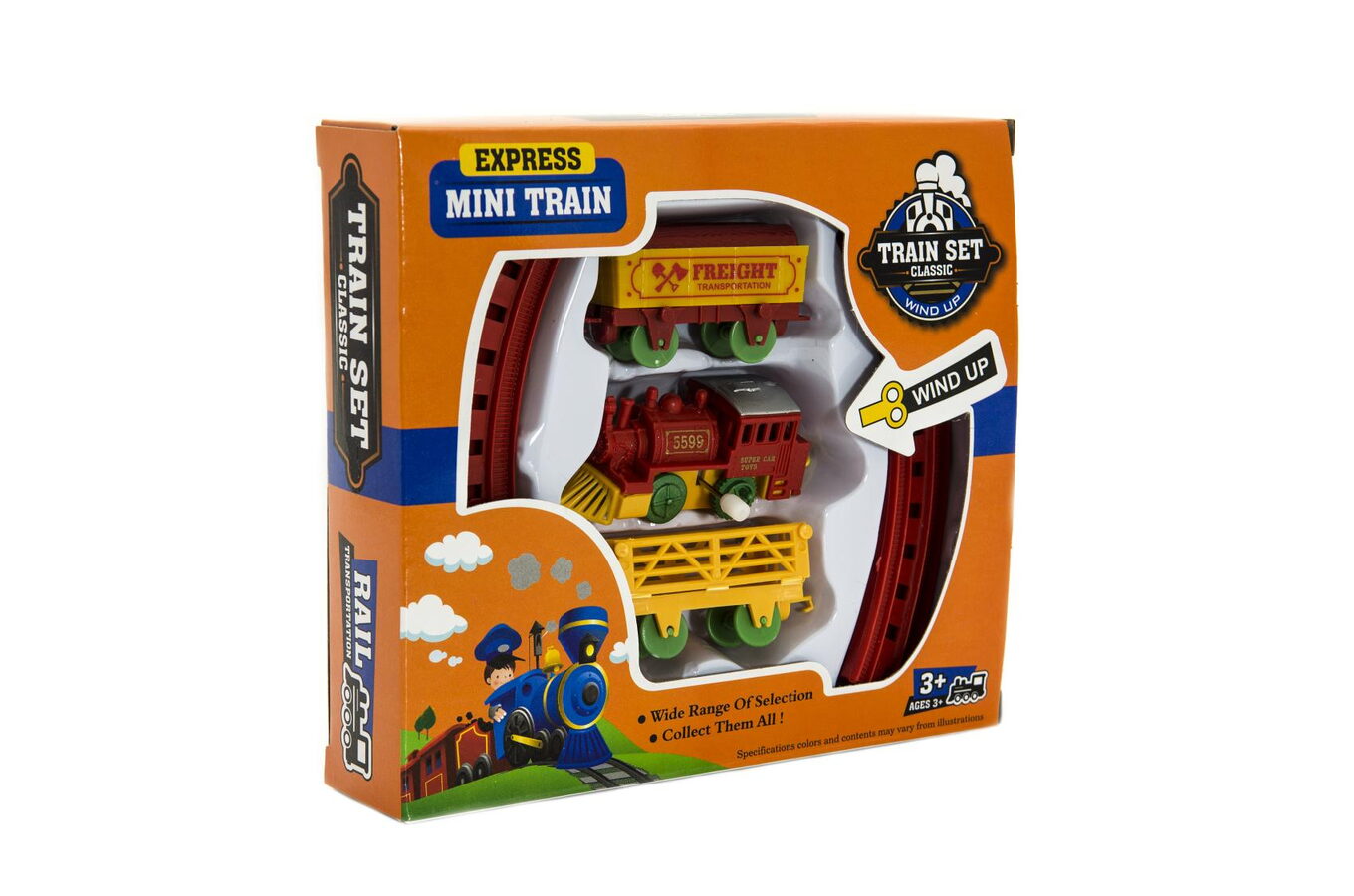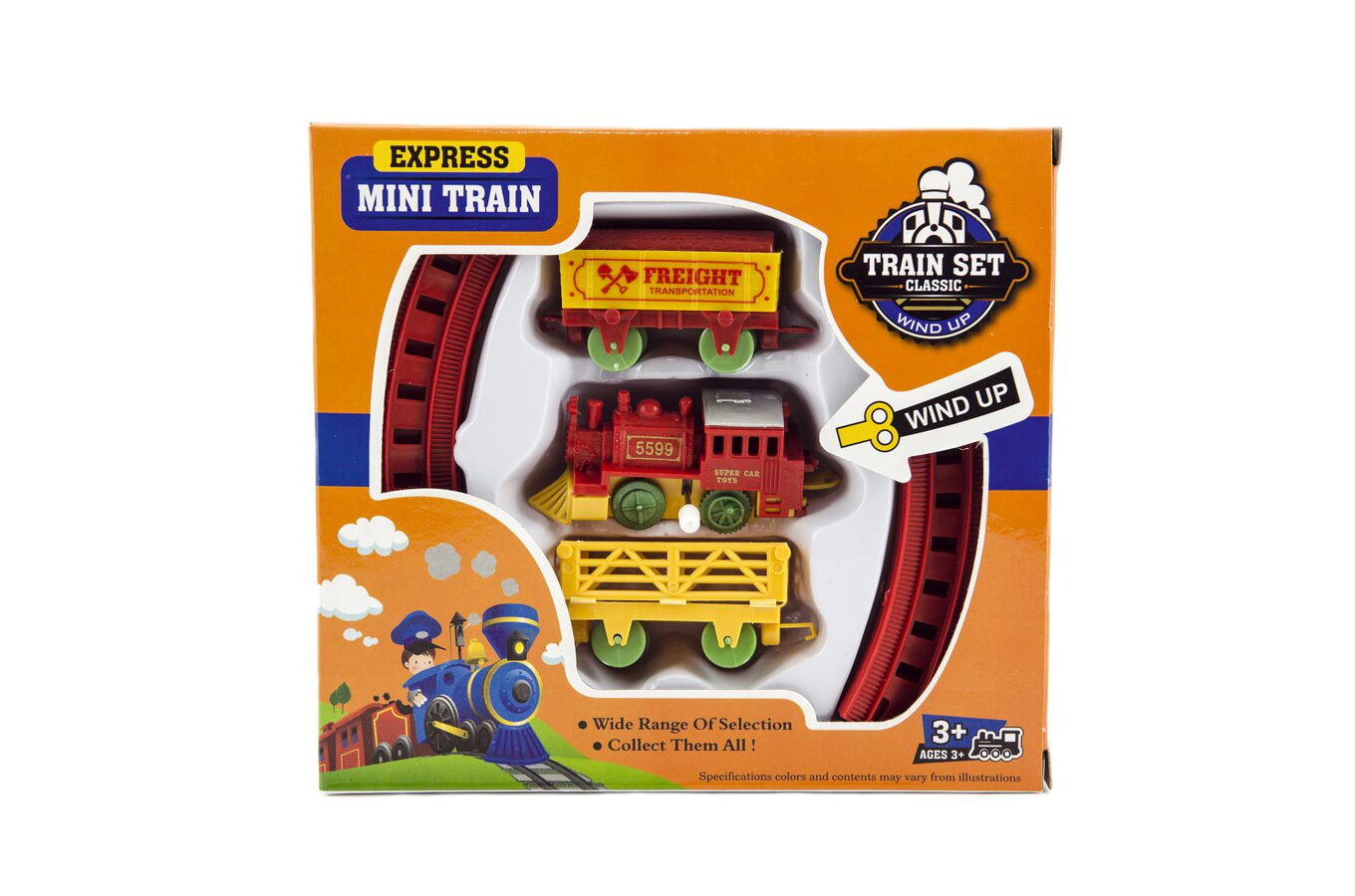 Vlak na klíček + 2 vagónky s kolejemi plast 7cm asst 2 barvy v krabičce 18x16x4c
