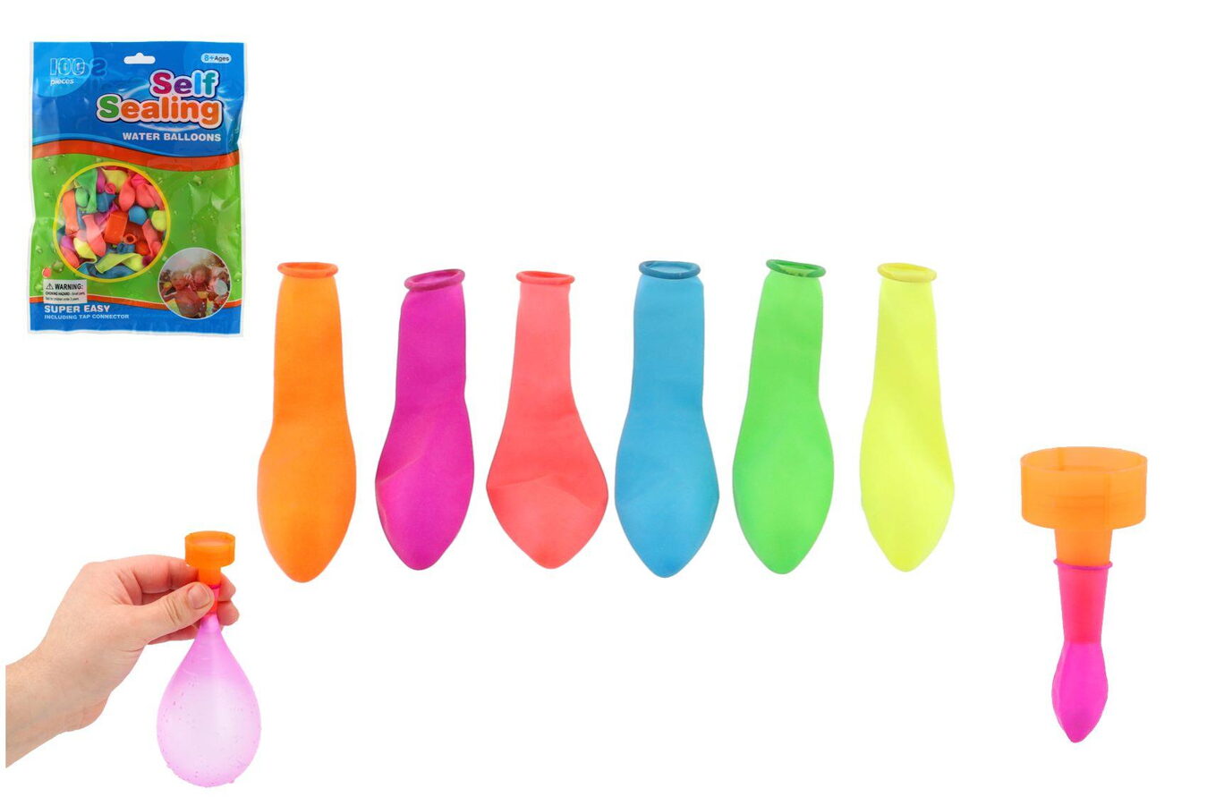 Vodní bomby jsou nafukovací balónky, které se napouští vodou a slouží jako munice v horkých dnech. Sada obsahuje 100 ks bomb s nástavcem na kohoutek.