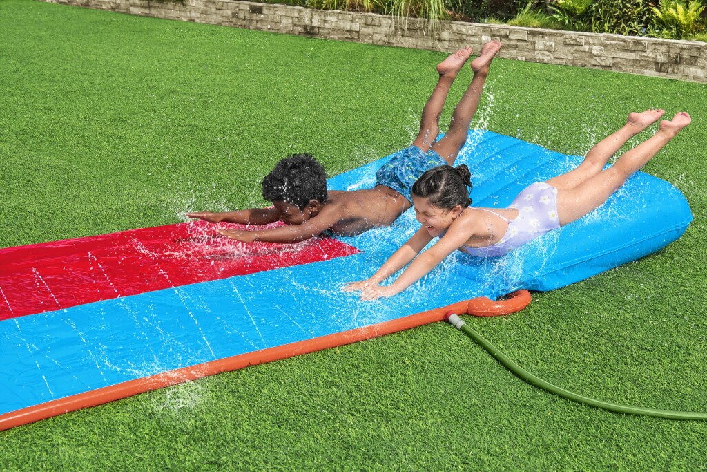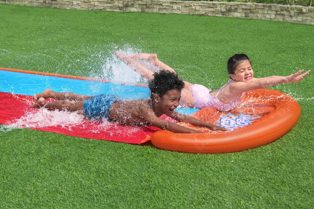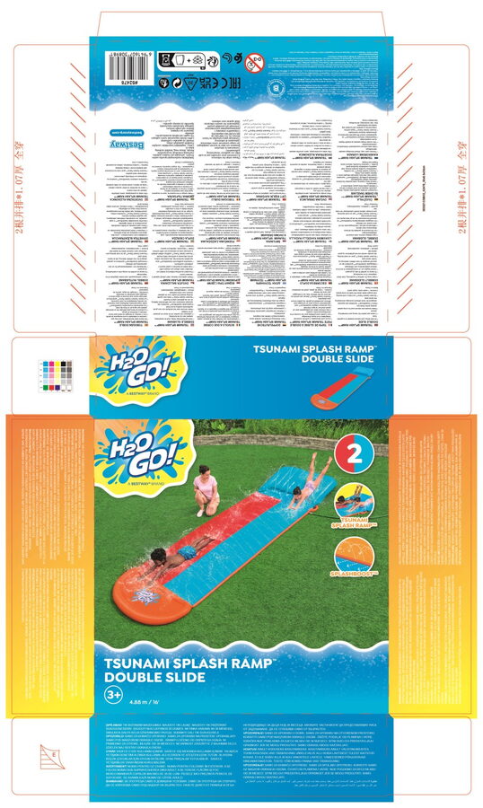 Délka 4,88 m, oranžovo-červeno – modrá vodní skluzavka, 2 dráhy. Opravná záplata součástí balení. Užijte si skvělou letní zábavu na vaší zahradě s vodní skluzavkou. Sestavení je velmi snadné – stačí připojit zahradní hadicí a začít se klouzat