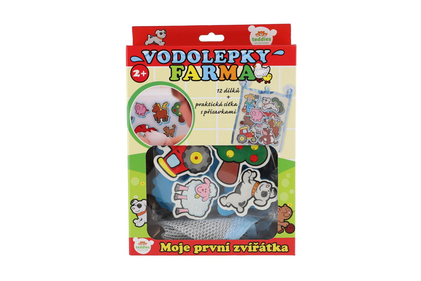 Pozvěte si do koupelny zvířátka z farmy. Vodolepky stačí namočit a hned jdou lepit na vanu i obklady. Snadno se přesouvají i sundávají, proto mohou děti tvořit stále nové příběhy. Sada obsahuje 12 vodolepek a praktickou síťku s přísavkami. Do ní lze po koupání vodolepky uklidit a tak snadno vyschnou. S vodolepkami budou všechny děti koupání milovat. Od věku: Roky 02 Pro holky / kluky: pro holky i kluky Material: Pěna