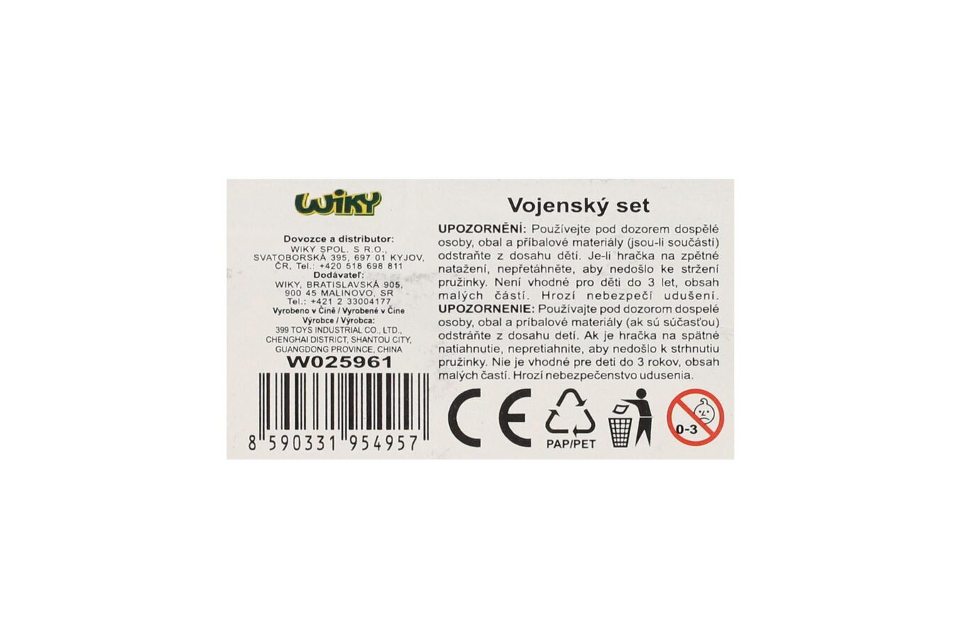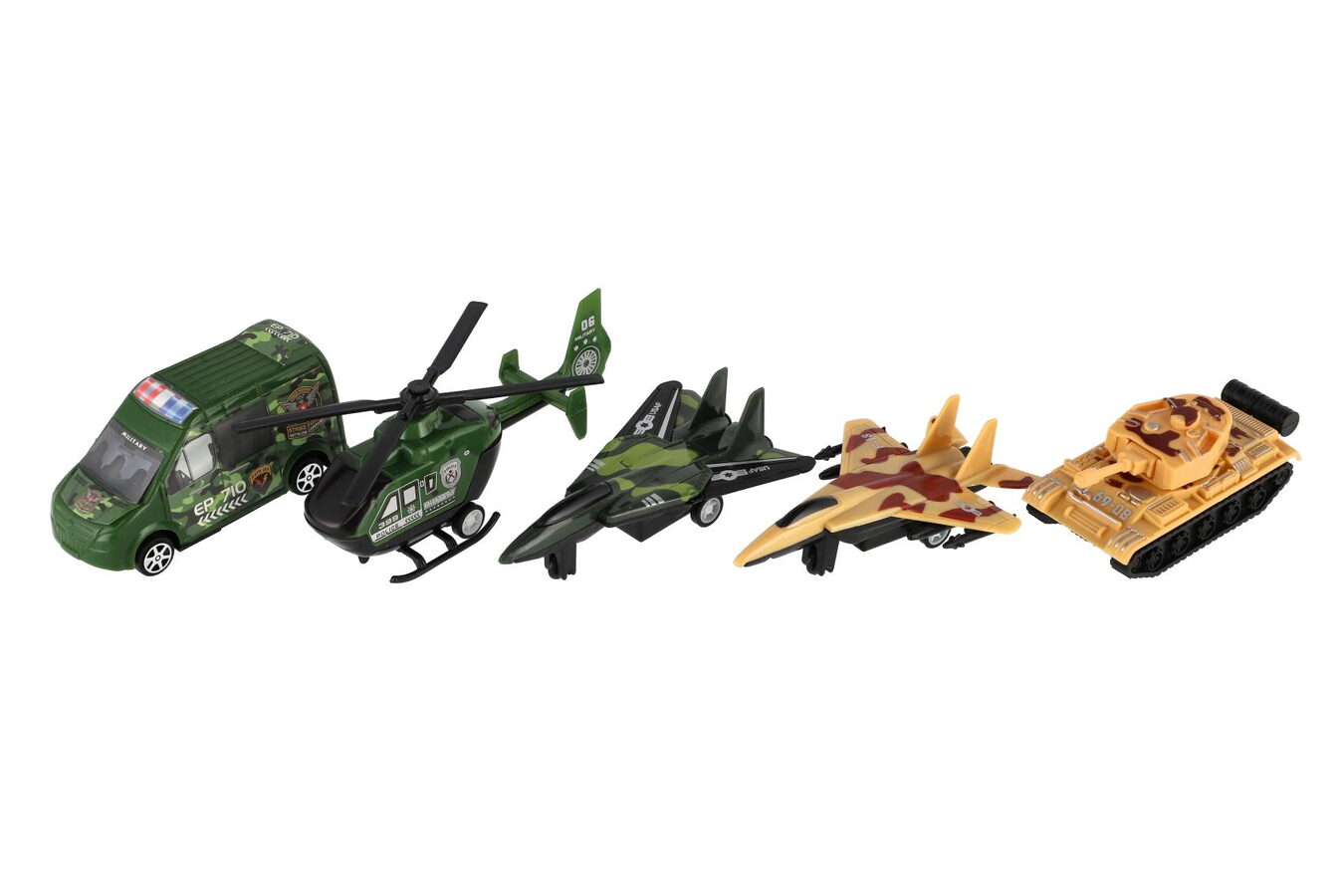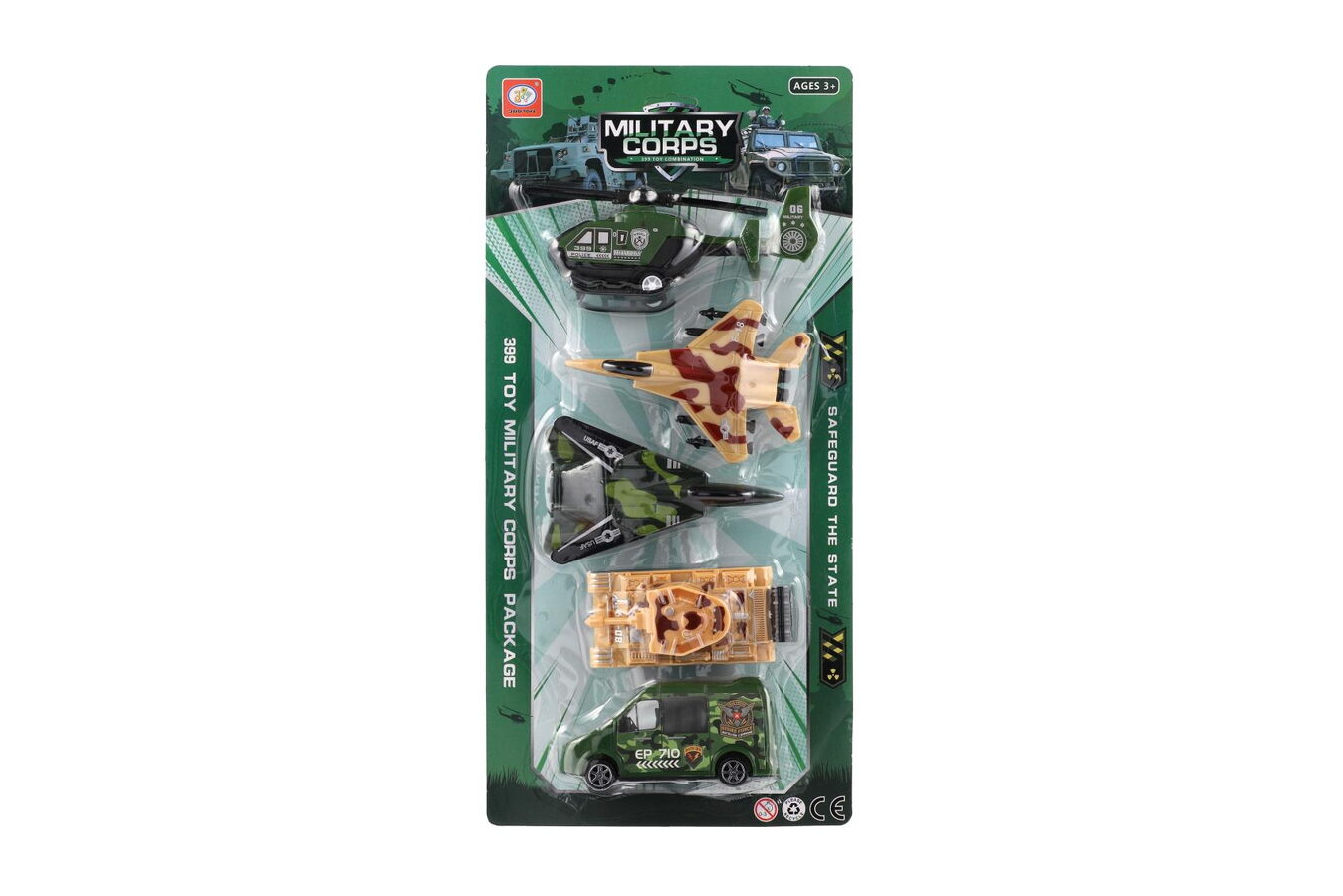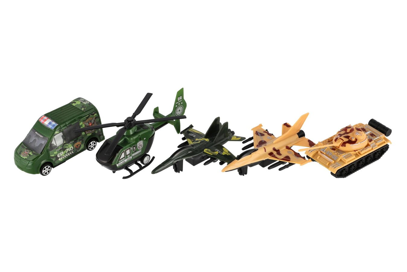 Vojenský set. Na zpětné natažení a volná kola. Velikost vrtulníku 16,5 cm. Součástí vrtulník, 2 stíhačky, tank, auto.