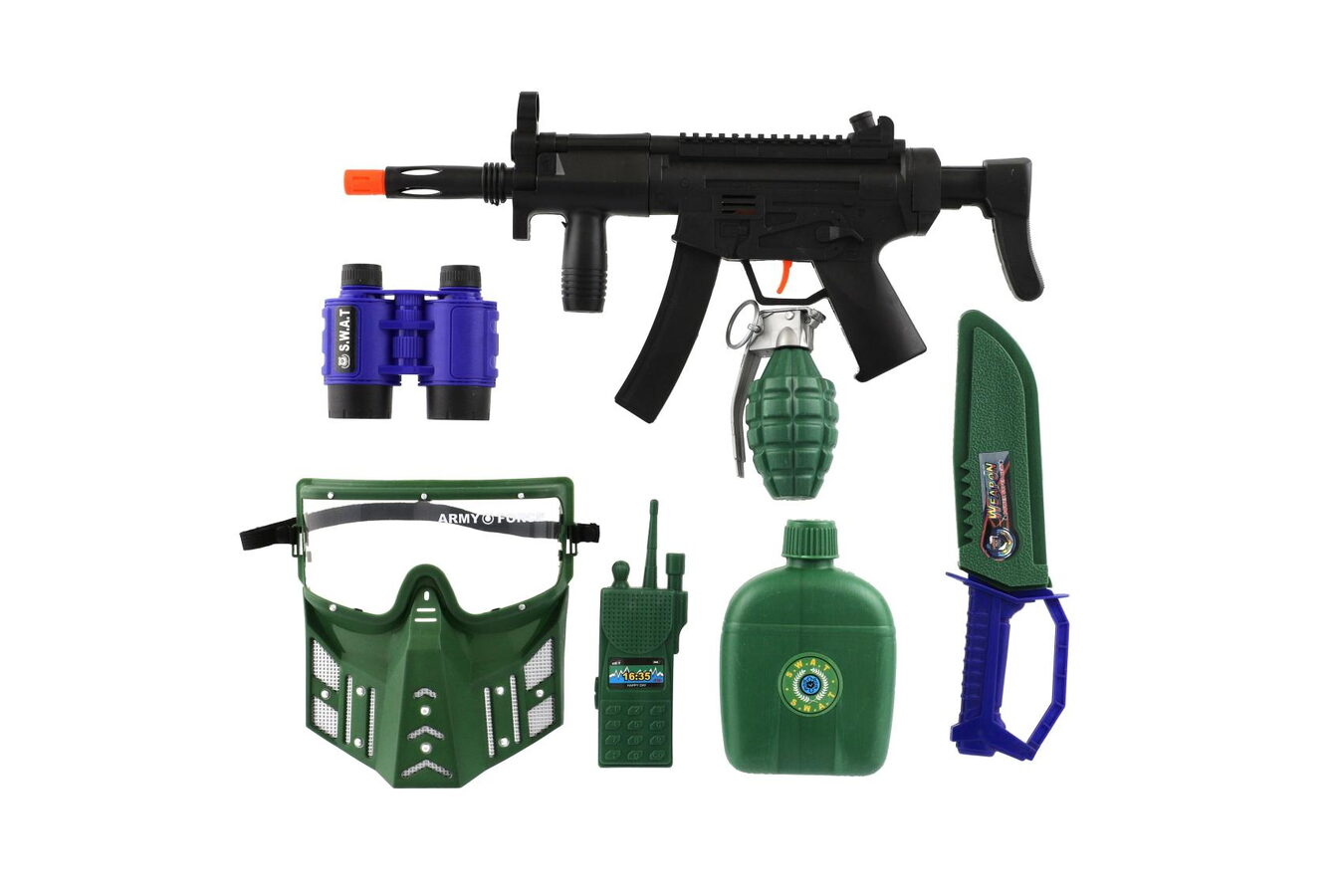 Připrav se na akci! Tato vojenská sada obsahuje plastový klapací samopal o délce 32 cm a tematické doplňky pro malé vojáky. Ideální pro akční hry, které podporují představivost, pohyb a dobrodružného ducha. Vše prakticky baleno v síťce.