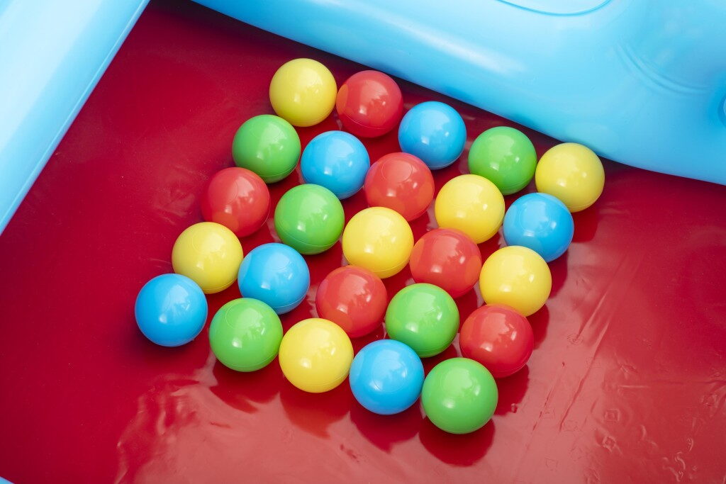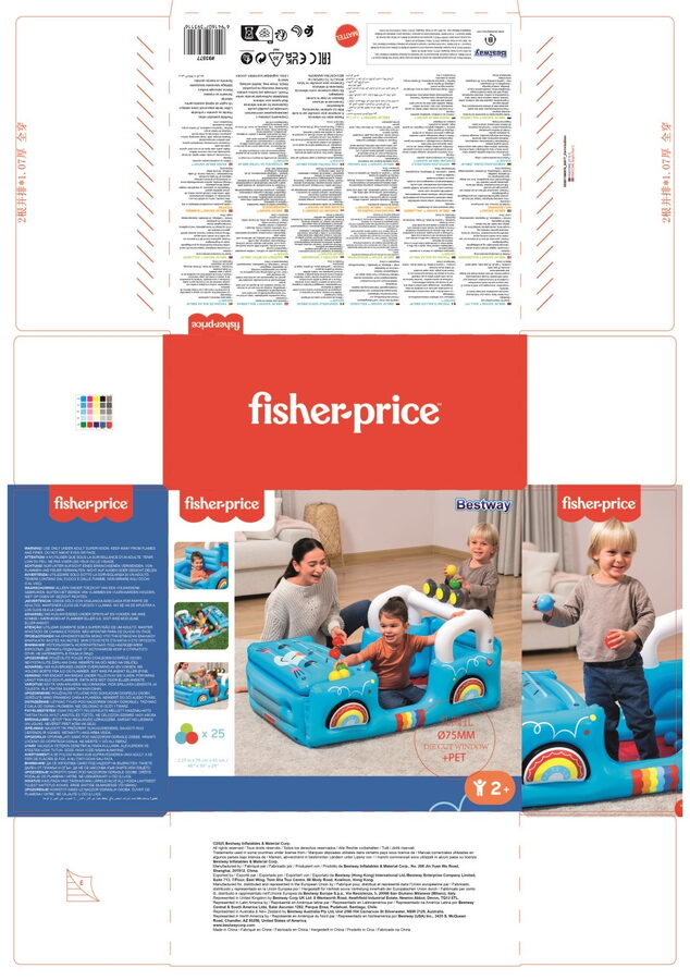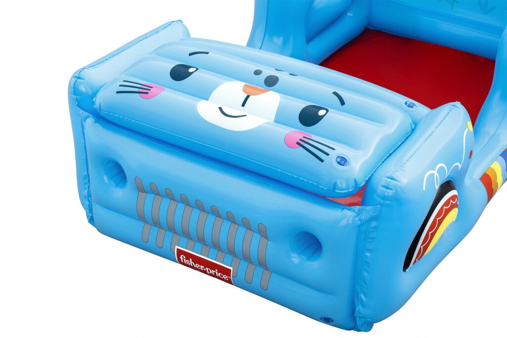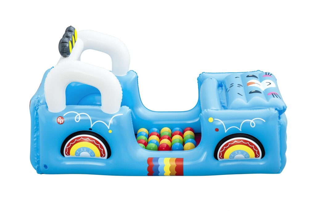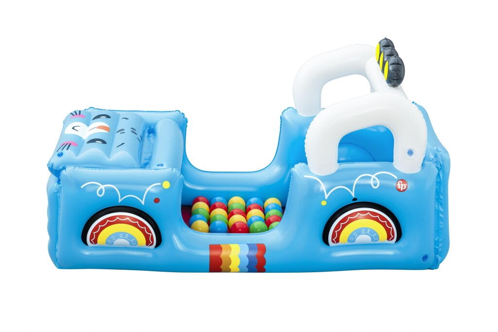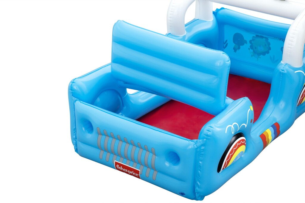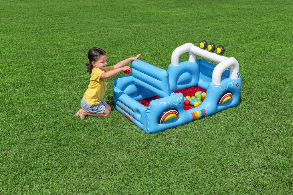 Tvar terénního vozidla s motivy džungle v provedení s otvírací kapotou Včetně 25 hracích míčků. Rozměry nafouknutého vozidla: 117×76×61 cm. Obsah: 1 bazének na míčky, 25 hracích míčků, záplata pro opravy