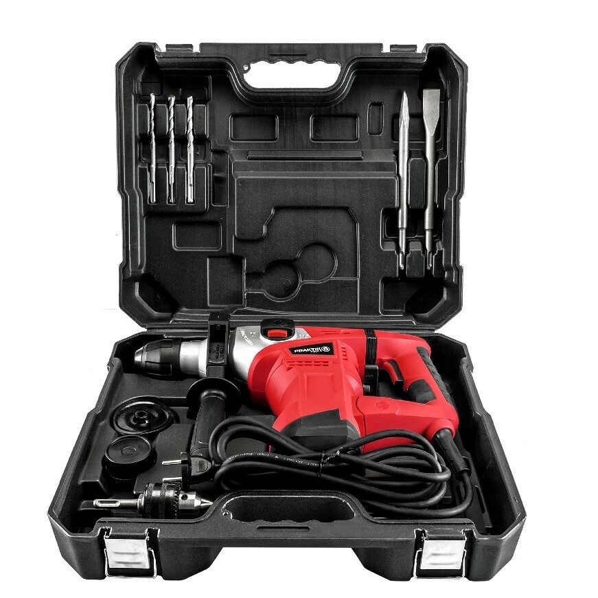 Vrtací a bourací kladivo s držákem nástrojů SDS+ je primárně určeno pro vrtání nebo sekání do betonu nebo zdiva. Navrženo pro náročnější práce. S přídavným sklíčidlem je možné vrtat do dřeva, kovu a plastu. Elektropneumatický vrtací mechanismus umožňuje uživateli snadno a rychle vrtat do betonu nebo zdiva bez únavy. Nářadí je vybaveno antivibrační rukojetí pro pohodlnou práci. Přídavná rukojeť pro lepší ovládání při práci. Dodávané příslušenství: sekáč, plochý sekáč, bity, ochrana proti prachu pro vrtání nad hlavou a mazací tuk. Přístroj je dodáván v přepravním kufříku.