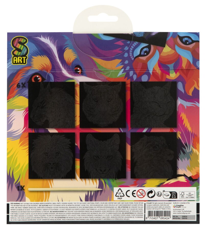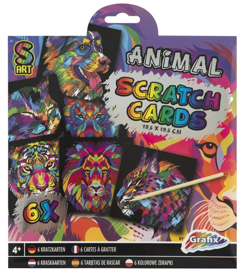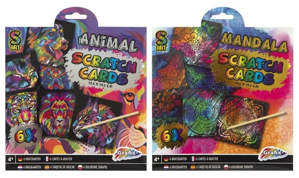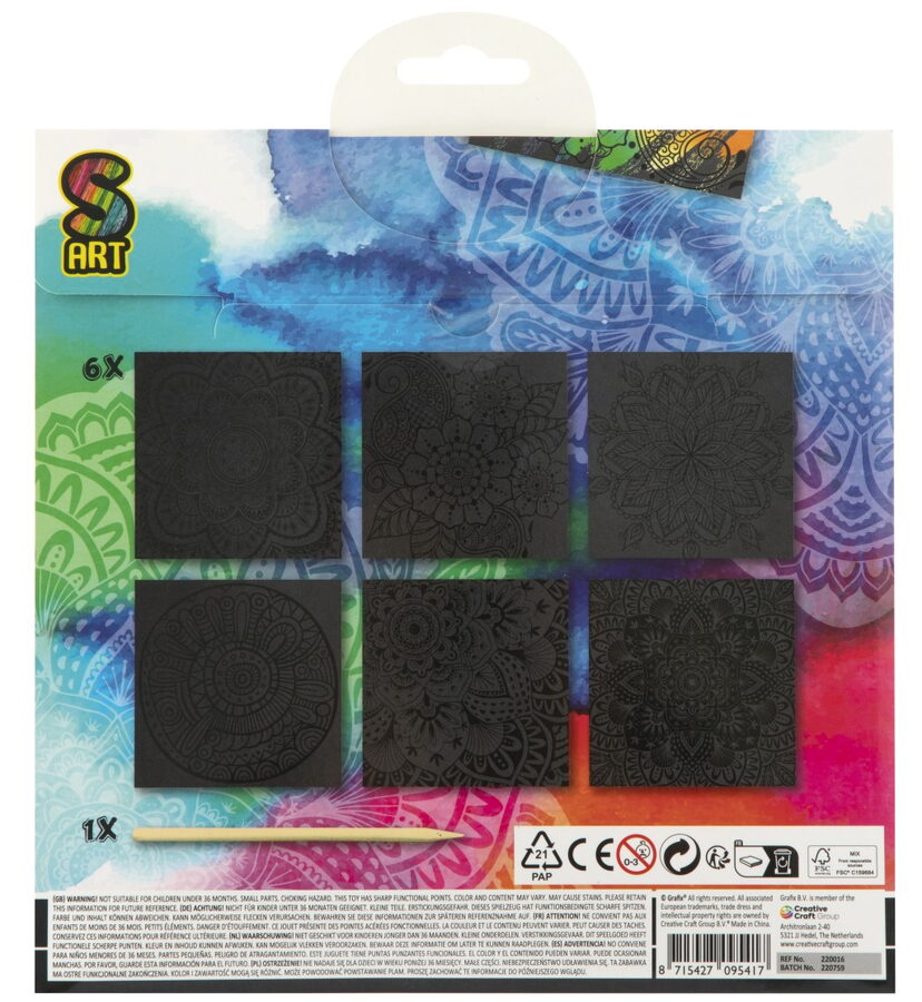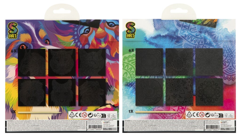 Vyšrabávací obrázky 6 ks v bablení. Velikost obrázku 19,5×19,5 cm, balení obsahuje i škrabátko. Dva různé druhy obrázků – zvířátka a mandala.