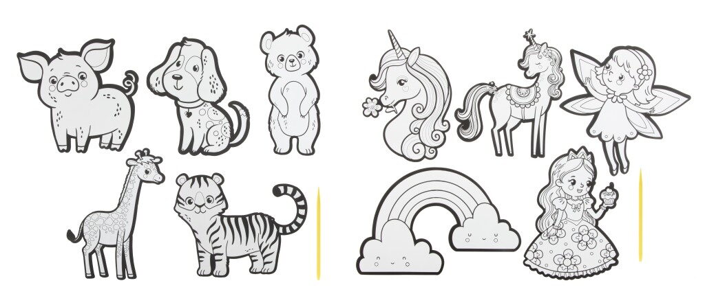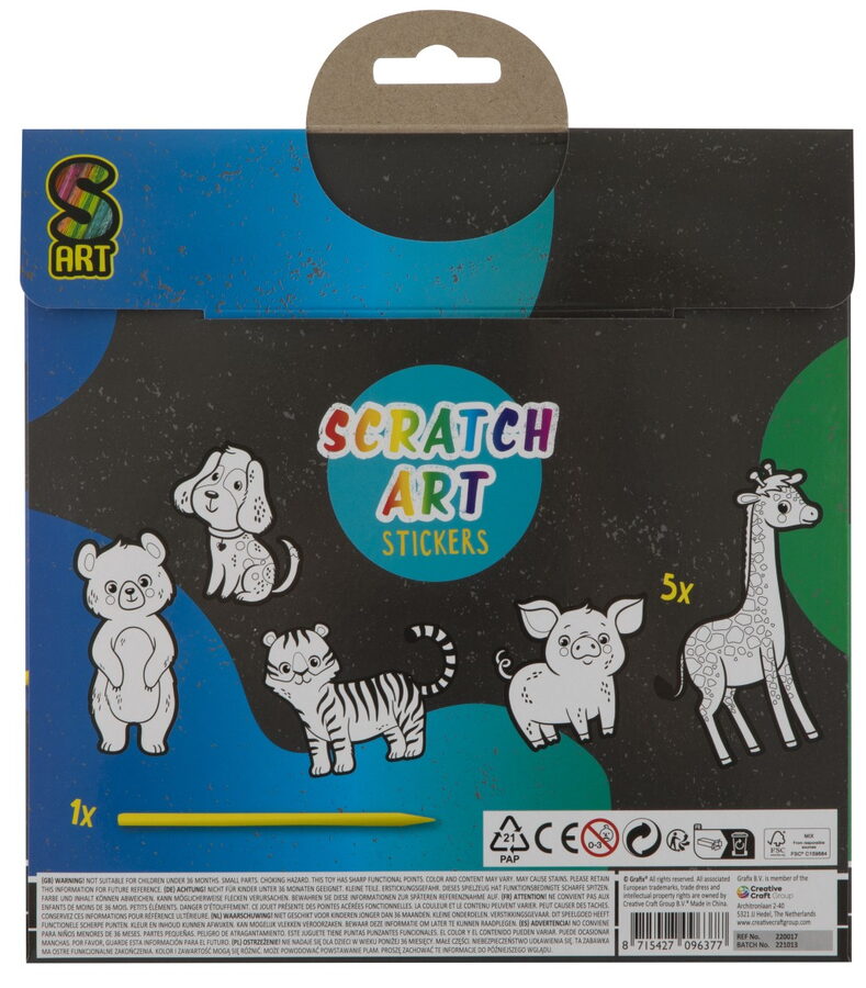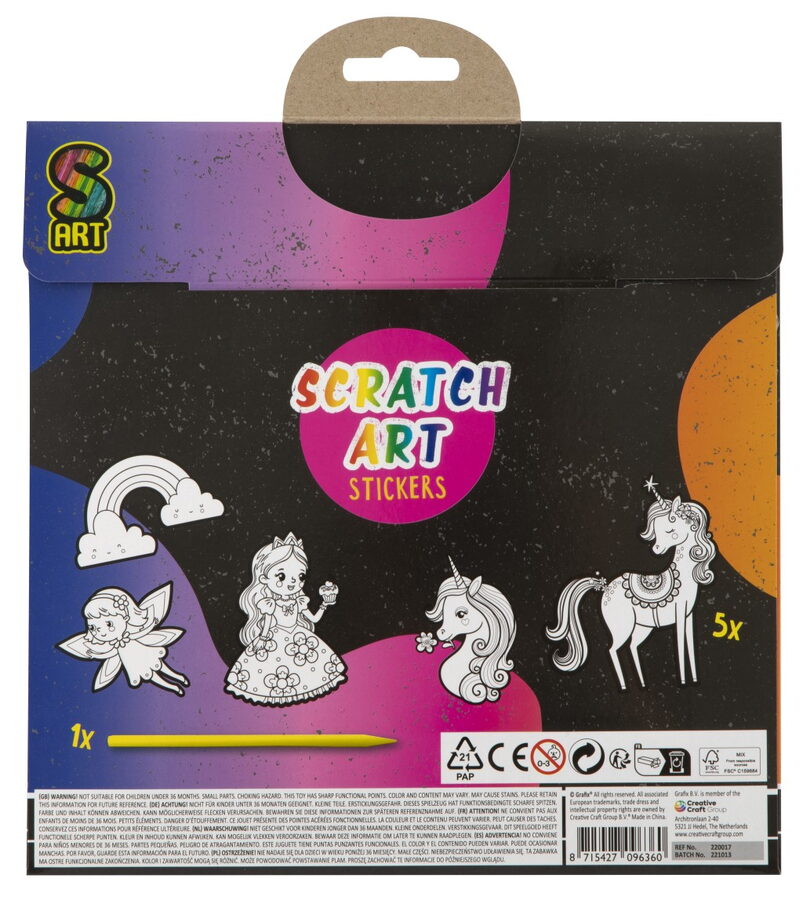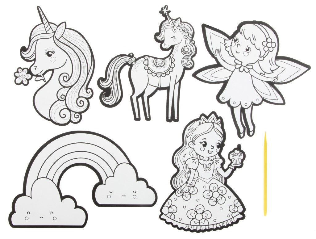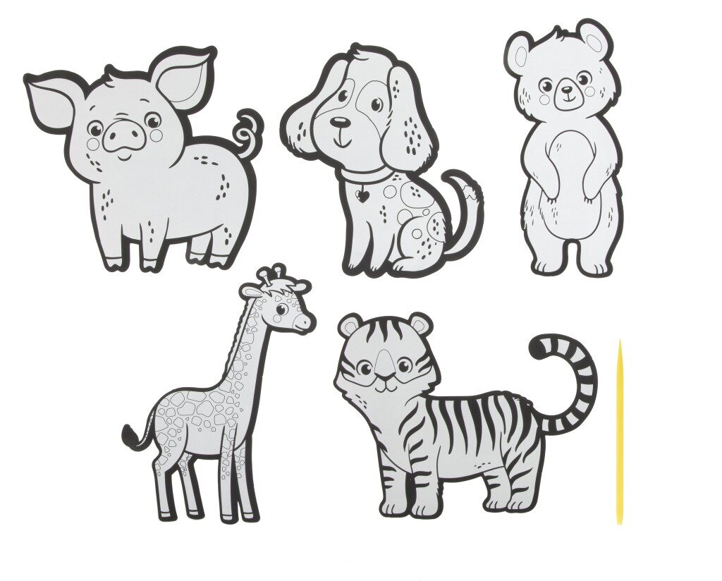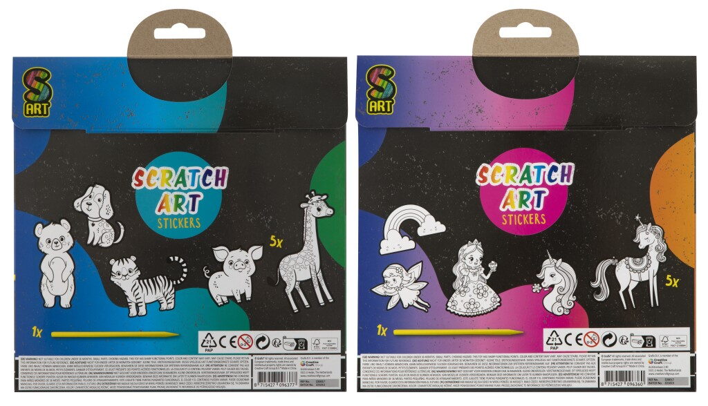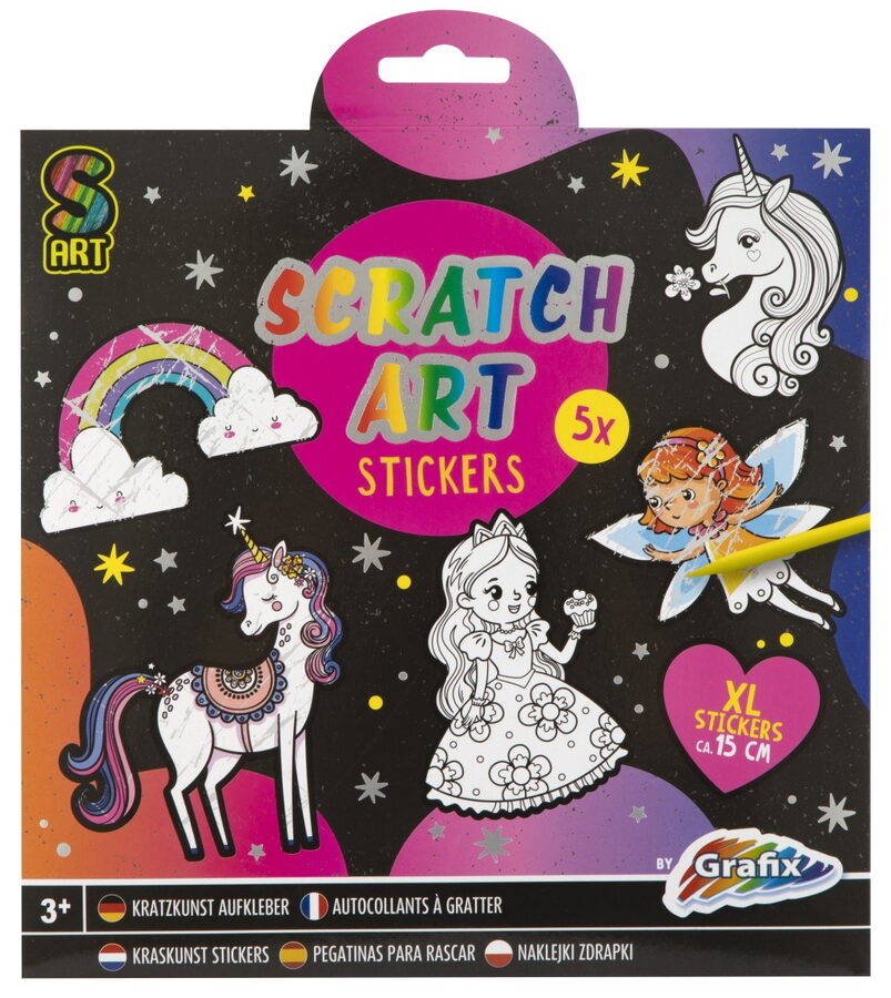 Vyškrabávací samolepky XXL 5 ks – balení obsahuje 5 vyškrabávacích samolepek a škrabátka. Dva různé designy – zvířátka a princezny.