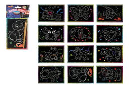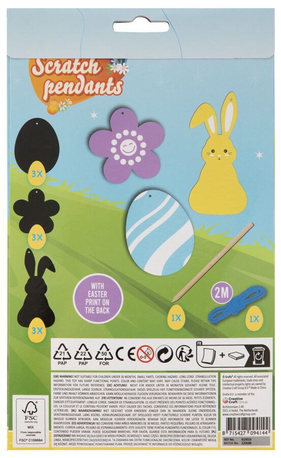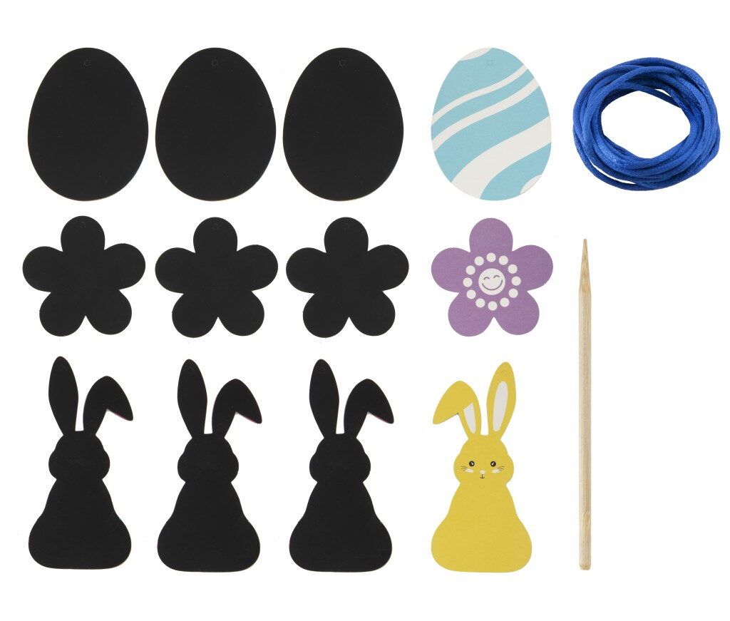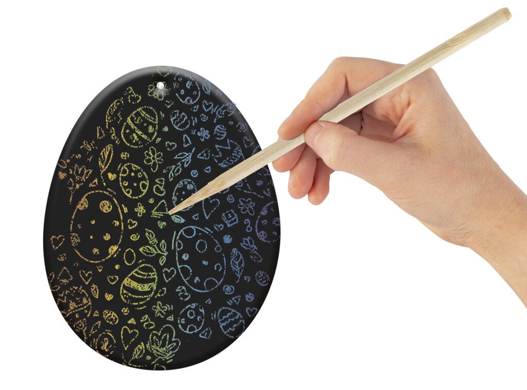 Vyškrabávací velikonoční přívěsky – balení obsahuje 3 vyškrabávací obrázky ve tvaru přívěsků + škrabátko.