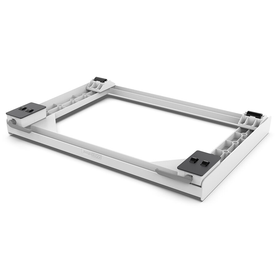 - páčky pro uvolnění brzd umístěné vpředu, snadno ovladatelné, i když je spotřebič vestavěný nebo umístěný v rohu nebo výklenku, se zvednutými pákami lze základnu se spotřebičem posouvat díky 4 odolným kolečkům, při spuštěných pákách se základna stabilně opírá o pryžové antivibrační nožičky a zůstává náležitě brzděna
