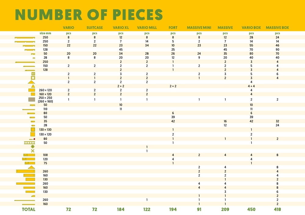 Variabilní stavebnice české výroby umožňuje sestavovat a znovu rozebírat nejméně 12 různých typů budov. Skládá se zejména z robustních kulatých, pečlivě opracovaných bukových dřívek s půlkulatými zámky, manipulace s nimi je výjimečně snadná a bezpečná. Obsahuje však také řadu precizně zpracovaných dílů dveří a oken, kompletní soupis jednotlivých součástí naleznete níže. Stavebnice řady Vario jsou mezi sebou kompatibilní, lze je kombinovat a vytvářet stále nové, rozmanité stavby, mohou tak růst spolu se schopnostmi a dovednostmi dětí. Přírodní povrchová úprava dílů umožňuje individuální úpravy jejich vzhledu, lze je lakovat a barvit dle fantazie. Díky svým jedinečným vlastnostem a zpracování může stavebnice nabídnout vysokou životnost a představovat zábavu předávanou po generace. Dodáváno v pevné a odolné kartónové krabici. Hlavní vlastnosti: 91 dílů celkemprecizní a pečlivé zpracováníz odolného masivního bukového dřevakompatibilní s dalšími stavebnicemi řady Variovyrobeno v České republice