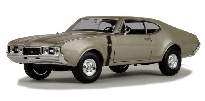 Welly - Oldsmobile(1968) model 1:34 zlaté Auto v měřítku 1:34 vyrobené z kovových a plastových dílů. Baleno v papírové krabičce s fóliovým průhledem. Otevírací dveře. Přišroubováno na papírovém podstavci s popisem typu. Délka autíčka 12 cm