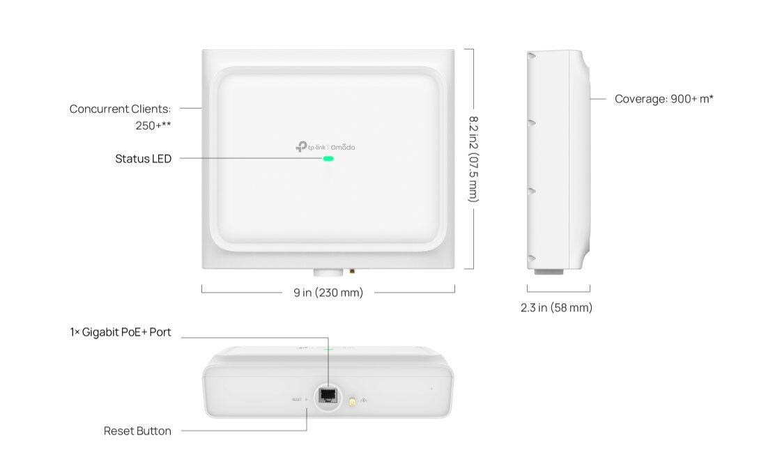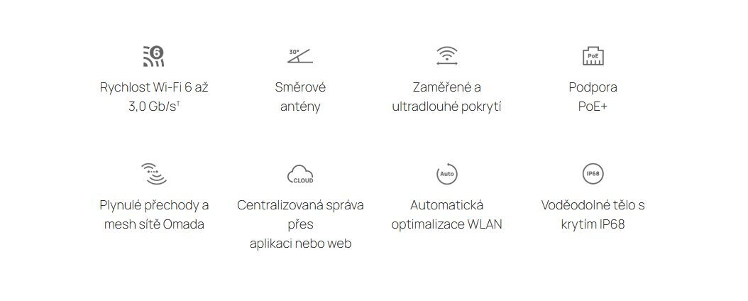 - Podporované funkce: 1024-QAM, DL/UL OFDMA, Více SSID (až 16 SSID, 8 na každém pásmu), Zapnutí/vypnutí bezdrátového rádia, Zapnutí/vypnutí vysílání SSID, Host síť, Automatické přiřazení kanálů, Regulace vysílacího výkonu (dBm), QoS (WMM), 2 × 2 (2,4 GHz & 5 GHz) DL/UL MU-MIMO, Omada Mesh§, Seamless Roaming (802.11k/v/r)§, Band Steering, Load Balance, Airtime Fairness, Beamforming, RADIUS Accounting, MAC autentizace, Plánování restartů, Plán bezdrátového vysílání, Statistiky, Statická/Dynamická IP