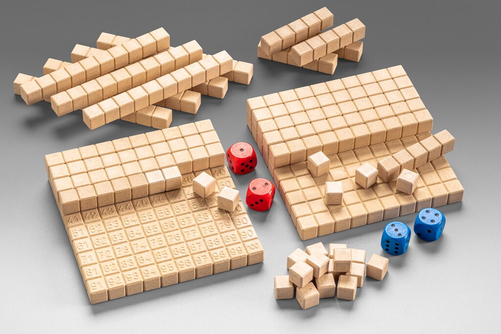 Tato didaktická pomůcka podporuje hravé procvičování a upevňování počtů v číselném oboru do 100. Děti si osvojují strukturované počítání, sčítání a odčítání v rozsahu 1–100 a zároveň se učí zvládat přechody přes desítky. Díky stovkové desce, ze které lze čísla vizuálně i hmatově vnímat, si žáci rozvíjejí porozumění desítkové soustavě a principům operativního počítání. Hra zároveň motivuje k vytváření vlastních úloh, ať už při samostatné práci, nebo formou soutěže. Možnost samokontroly vede děti k samostatnosti a zvyšuje jejich zájem o matematiku. Vyrobeno z pevného 100% recyklovaného dřeva s certifikací PEFC, které je po použití opakovaně recyklovatelné. Zabaleno v kartonové krabičce s návodem. Obsah balení: 2 oboustranné desky s čísly 1–100 (jedna strana s vystouplými čísly, druhá strana bez čísel)22 tyček po deseti6 tyček po pěti28 jednotkových kostiček2 červené a 2 modré hrací kostky1 návod ve 4 jazycích (DE, EN, FR a ES) Hlavní vlastnosti: procvičování sčítání a odčítánírozvoj strukturovaného počítánínácvik přechodu přes desítkumotivuje ke tvoření vlastních úlohvhodné pro samostatnou práci i skupinové aktivityvyrobeno v Německu Zkrácená pravidla hry:Hráči si před sebe položí hrací desku buď potištěnou, nebo nepotištěnou stranou nahoru. Vyberou si verzi hry, kterou budou hrát - sčítání, nebo odčítání. V obou verzích hry tah začínají hodem kostkami a na tahu se střídají.Při verzi sčítání dle hozené hodnoty desku vyplňují tyčkami a kostičkami. Ty se také během hry snaží, pokud je to možno, vyměnit za tyčky z 10 kostiček. Cílem je jako první zakrýt svou desku.Při verzi odčítání dle hozené hodnoty z desky odebírají tyčky, které postupně mění na kostičky. Cílem je jako první odkrýt svou desku.