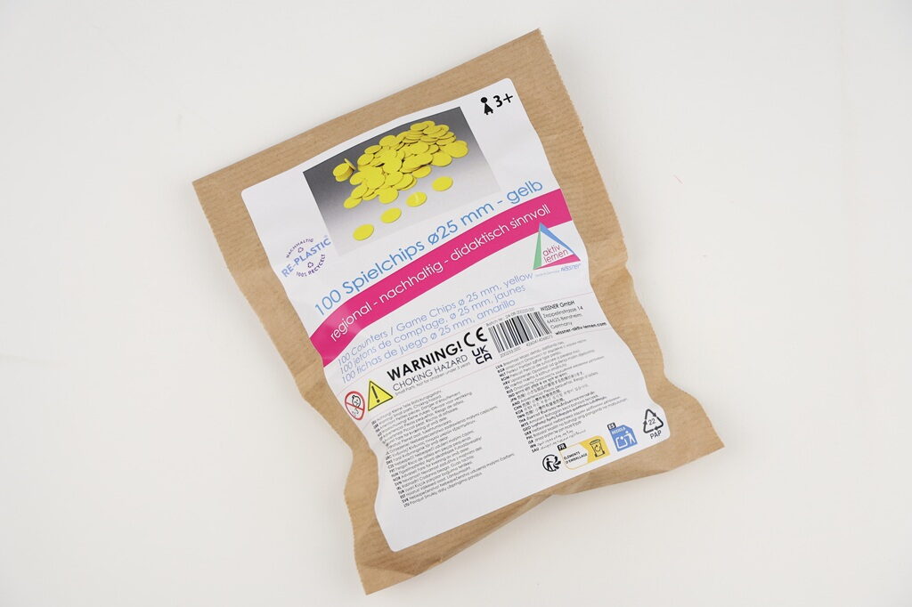 Univerzální herní žetony vhodné jako doplněk ke společenským a výukovým hrám. Podporují rozvoj porozumění množství, třídění a porovnávání. Ideální pro počítání, bodování nebo vizuální znázornění úloh. Vyrobeno ze 100% recyklovaného plastu, který je po použití opakovaně recyklovatelný. Zabaleno v uzavíratelném papírovém sáčku s certifikací FSC. Hlavní vlastnosti: 100 žlutých žetonůvhodné pro školní i domácí použitírozvíjí počítání a vnímání množstvívyrobeno v Německu