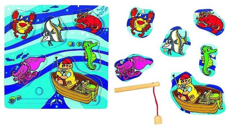 Wonderworld Dřevěné puzzle Chytání ryb Dřevěné puzzle chytání ryb v sobě skrývá dvě zábavné a naučné hry. Nejprve mořské živočichy děti vyloví z moře díky magnetkám umístěným na rybkách a rybářském prutu. Poté zvířátka mohou děti pustit zpět do moře tak, že je podle tvarů puzzle správně vloží na destičku. Krásné, ekologické, nápadité. Jedny z nejlepších dřevěných hraček současnosti.Hračky jsou vyrobeny z těch nejlepších materiálů a masivního dřeva, s velkým důrazem na perfektní zpracování, design a kvalitu.Značka Wonderworld se pravidelně umisťuje v mnoha hračkářských soutěžích a je držitelem četných ocenění v zemích z celého světa.