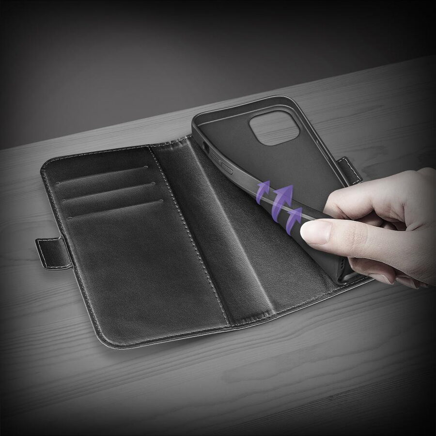 Flipové pouzdro na mobilní telefon vyrobené z odolné syntetické kůže ochrání displej proti škrábancům a telefon samotný proti mechanickému poškození při pádech na zem. Elegantní kožený design evokující peněženku díky zabudovaným přihrádkám na karty a jedné velké kapse na bankovky. Displej telefonu ochrání proti nečekaným škrábancům pevné flipové pouzdro které zamknete pomocí bočního magnetu. Vnitřní pouzdro telefonu vyrobné z měkkého silikonu ochrání telefon proti nárazům, škrábancům a znečištění a zaručí přístup k ovladácím prvkům telefonu.
