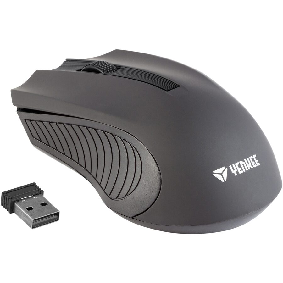 Bezdrátová optická myš ergonomického tvaru s pogumovaným povrchem, USB rozhraní, optické rozlišení 1000 dpi, 3 tlačítka, napájení 2x AAA baterie, rozměry 115 x 66 x 32 mm.