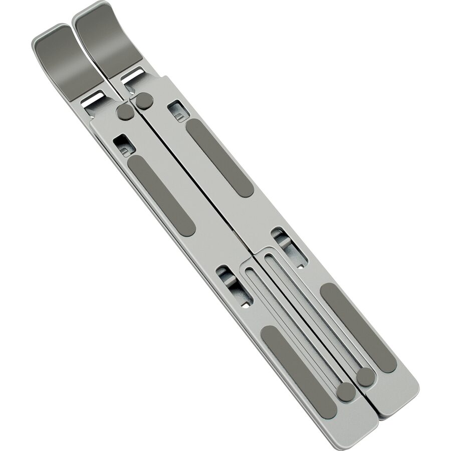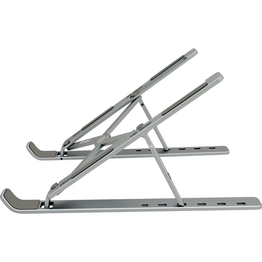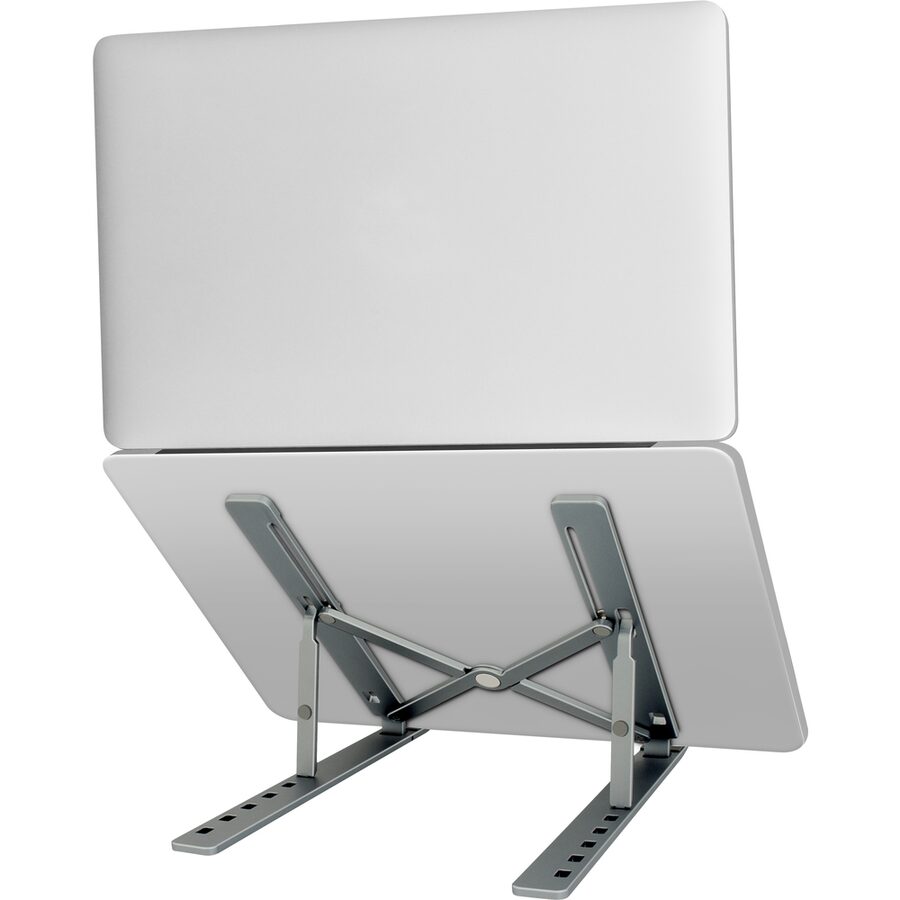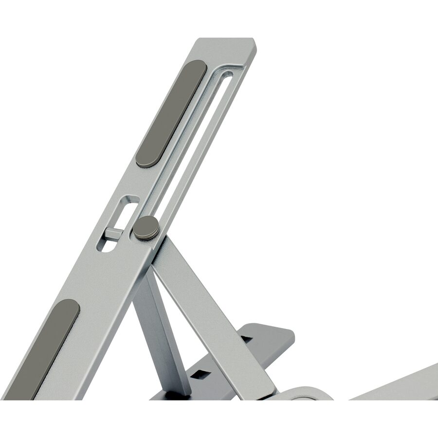 Přenosný kovový stojan pro tablety a notebooky do velikosti až 15.6"" umožňuje nastavení až 6 různých pohledových úhlů. Jednoduchý způsob složení umožňuje vzít držák sebou do kanceláře, domů nebo na cesty. Součástí balení je látkový pytlík pro lepší přesnost držáku. Protiskluzové prvky zajišťují stabilitu při práci a ochranu proti poškrábání vašeho zařízení. Možnost nastavení až 6 pohledových úhlů podporuje lepší ergonomii těla při práci. Notebook využijete jako stolní počítač. Konstrukce držáku zlepšuje chlazení vašeho notebooku při práci.