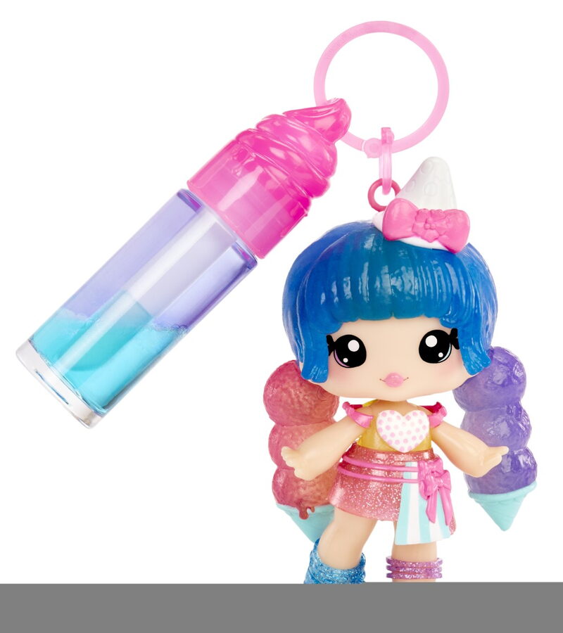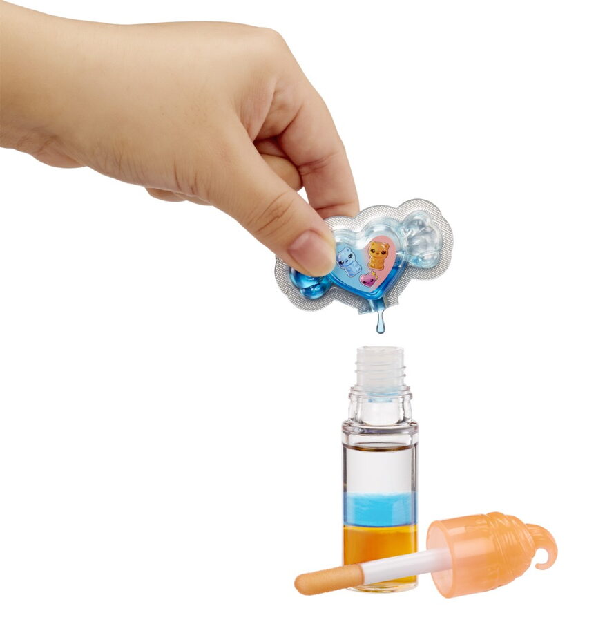 1. Otevři tubu s leskem na rty. 2. Přidej do tuby barvu. 3. Barvy promíchej. Roztomilá voňavá panenka má outfit a boty, které můžeš sundat. Panenku i lesk na rty si můžeš vzít na cesty, stačí spojit s přívěskem na klíče.