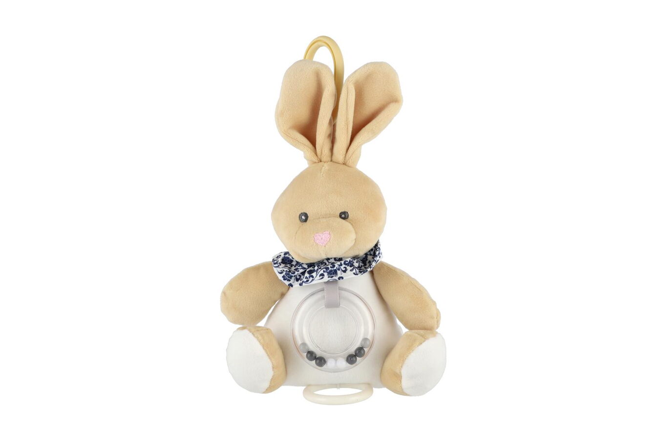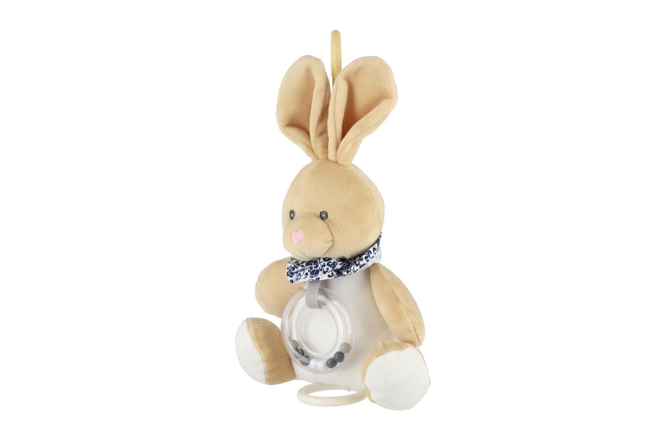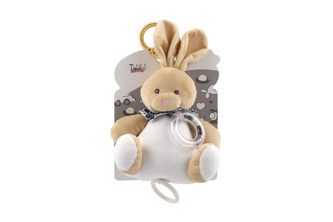 Roztomilý béžový natahovací zajíček hraje příjemnou melodii, která miminko uklidní a pomáhá mu při usínání. Hračku lze zavěsit za pomocí klipu na postýlku nebo kočárek. Hrací strojek je zabudovaný uvnitř zajíčka.