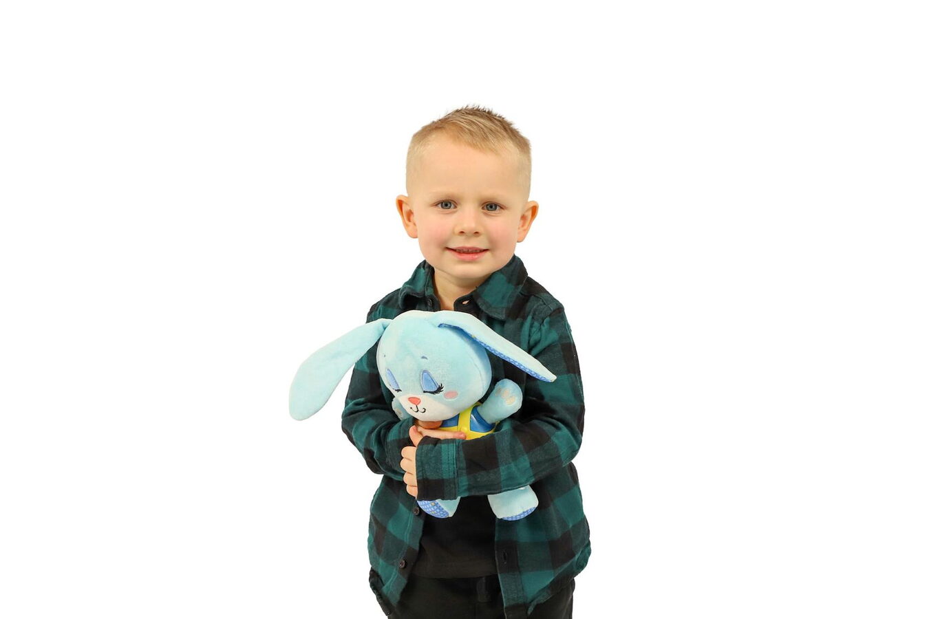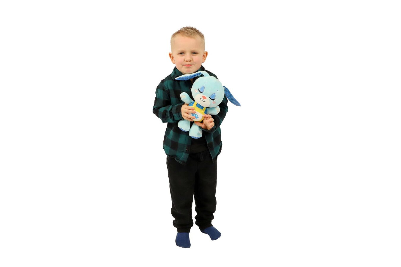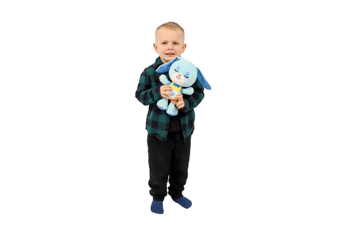 Zajiček je vyroben z hebkého plyše a má plastový panel se světelnými a zvukovými efekty. Po stisknutí tlačítka zahraje jemnou melodii, která uklidní dítě a podbarví příjemnou atmosféru tlumeným světýlkem. Díky napájení na baterie lze hračku snadno používat kdekoliv – v postýlce, kočárku i na cestách.