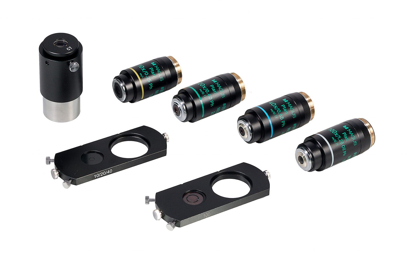 Fázové objektivy se od běžných objektivů liší tím, že mají fázový kroužek v rovině výstupní pupily. Rovinné achromatické fázové objektivy vytvářejí obraz, který má stejné ohnisko ve středu i na okrajích, a proto je zkreslení zanedbatelné. Chromatická aberace je korigována pro modré a červené, sférická aberace pro zelené světlo a zakřivení pole je korigováno na 90 % průměru zorného pole. Objektiv 10x je navržen pro práci se vzorky s krycím sklíčkem nebo bez něj. Objektivy 20x, 40x a 100x se používají k pozorování vzorků s krycím sklíčkem o průměru 0,17 mm. Objektiv se 100x podporuje pozorovávání při ponoření preparátu do olejové lázně. Objektivy jsou navrženy pro délku tubusu korigovanou na nekonečno. Parfokální vzdálenost je 60 mm.