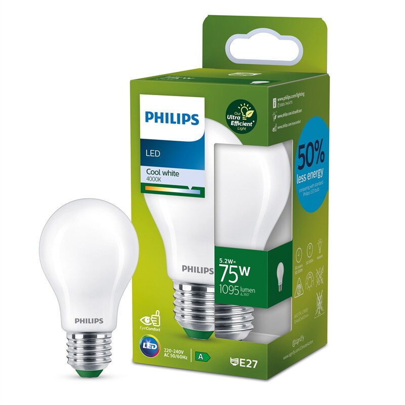 Svítidla LED Philips UltraEfficient zajišťují krásné světlo. Nabízí vám výjimečně dlouhou životnost (50 000 hodin) a přináší okamžité a výrazné energetické úspory. Měňte svítidla méně často a současně si vychutnejte světlo, které je šetrné k očím, protože využívá naši osvědčenou technologii EyeComfort.