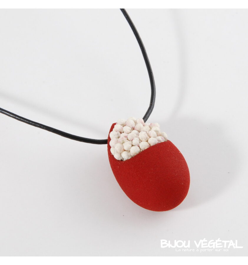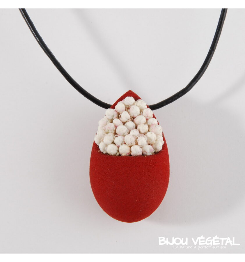 Živé šperky - Náhrdelník Slza červený s trvalými bílými květy Nádherný módní doplněk ve výrazné barvě v kombinaci s trvalými bílými květy vytváří neobyčejný elegantní živý šperk. Živé šperky jsou stabilizovány patentovanou technologií a nepotřebují prakticky žádnou údržbu. Živé šperky sou baleny v krabičce, součástí balení je náhradní trvalá rostlina. Živé šperky jsou vyrobeny ručně ve Francii. Výrobce garantuje neomezenou životnost, při vhodném používání. Živé šperky nesmí být vystaveny velkým teplotním změnám a přímému proudu vody (při koupání, mytí nádobí apod.) Živé šperky byly poprvé představeny na mezinárodním veletrhu klenotů Bijorhca v Paříži roku 2015. Vytvořily je designové návrhářky a dlouholeté kamarádky Maryse a Manuella pro společnost Radis et Capucine. Živé šperky umožňují stálé propojení s přírodou a přinášejí ji doslova na dosah ruky. Francouzská značka Radis et Capucine