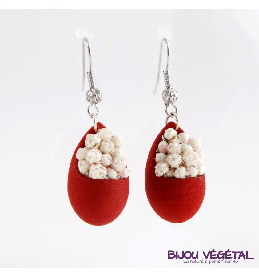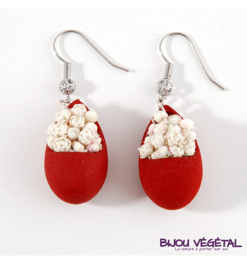 Živé šperky - Náušnice Slza červené s trvalými bílými květy Nádherný módní doplněk ve výrazné barvě v kombinaci s trvalými bílými květy vytváří neobyčejný elegantní živý šperk. Živé šperky jsou stabilizovány patentovanou technologií a nepotřebují prakticky žádnou údržbu. Živé šperky sou baleny v krabičce, součástí balení je náhradní trvalá rostlina. Živé šperky jsou vyrobeny ručně ve Francii. Výrobce garantuje neomezenou životnost, při vhodném používání. Živé šperky nesmí být vystaveny velkým teplotním změnám a přímému proudu vody (při koupání, mytí nádobí apod.) Živé šperky byly poprvé představeny na mezinárodním veletrhu klenotů Bijorhca v Paříži roku 2015. Vytvořily je designové návrhářky a dlouholeté kamarádky Maryse a Manuella pro společnost Radis et Capucine. Živé šperky umožňují stálé propojení s přírodou a přinášejí ji doslova na dosah ruky. Francouzská značka Radis et Capucine