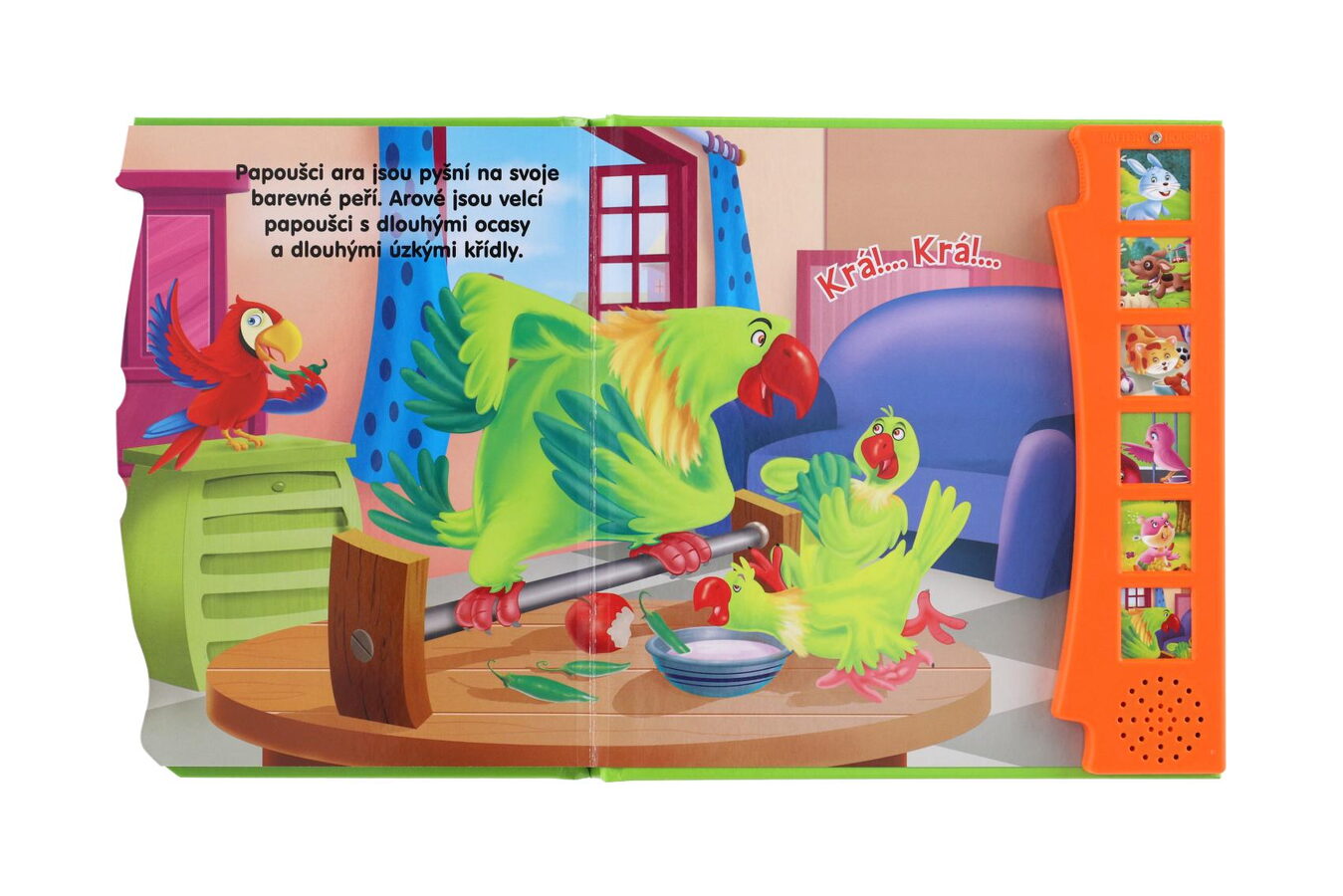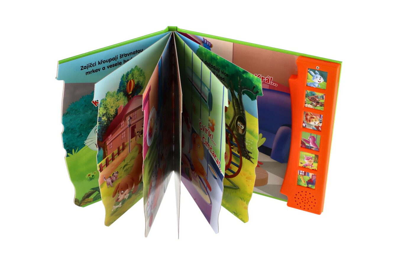Zmáčkněte, prohlížejte obrázky a poslouchejte! Knížka seznámí děti se zvířátky, která žijí doma a na dvorku. Stisknou tlačítko a mohou si poslechnout, jak dělá pejsek, kočička, papoušek, králíček a další zvířátka.