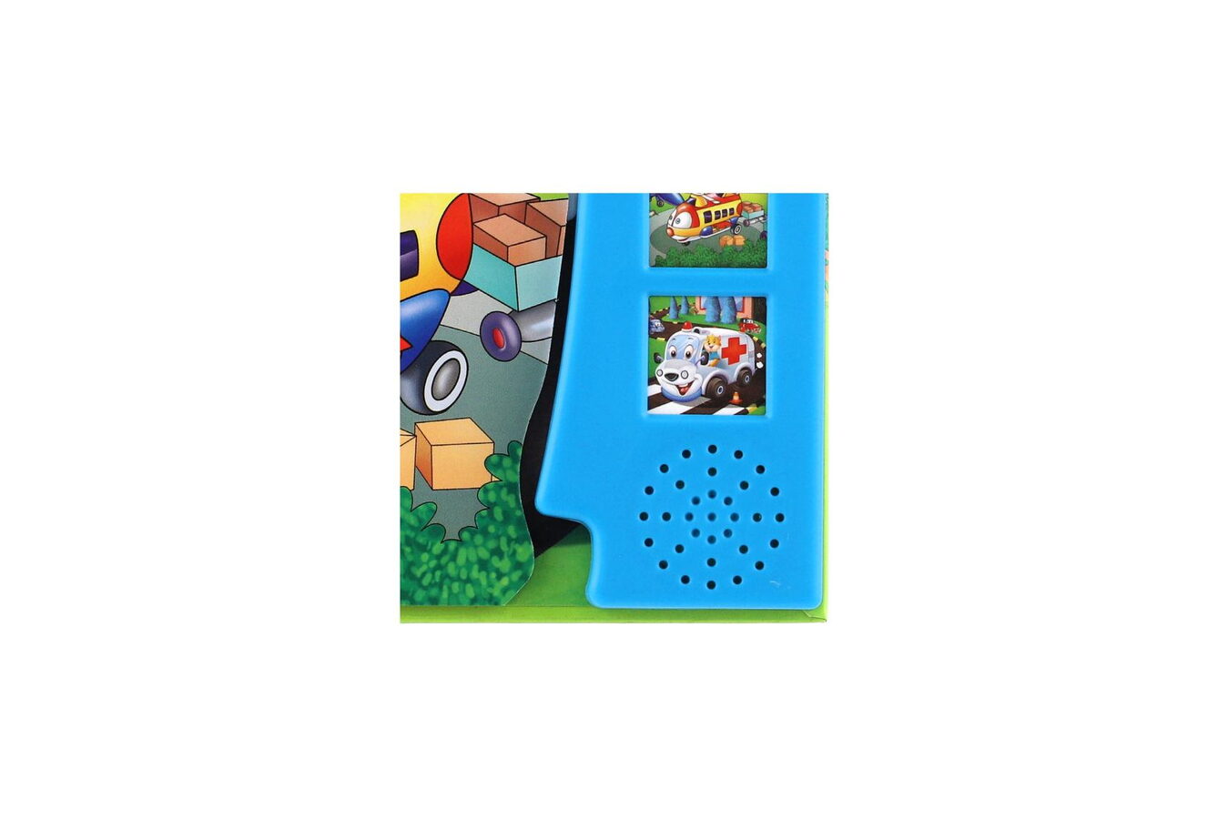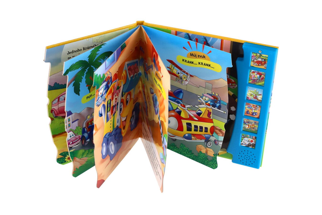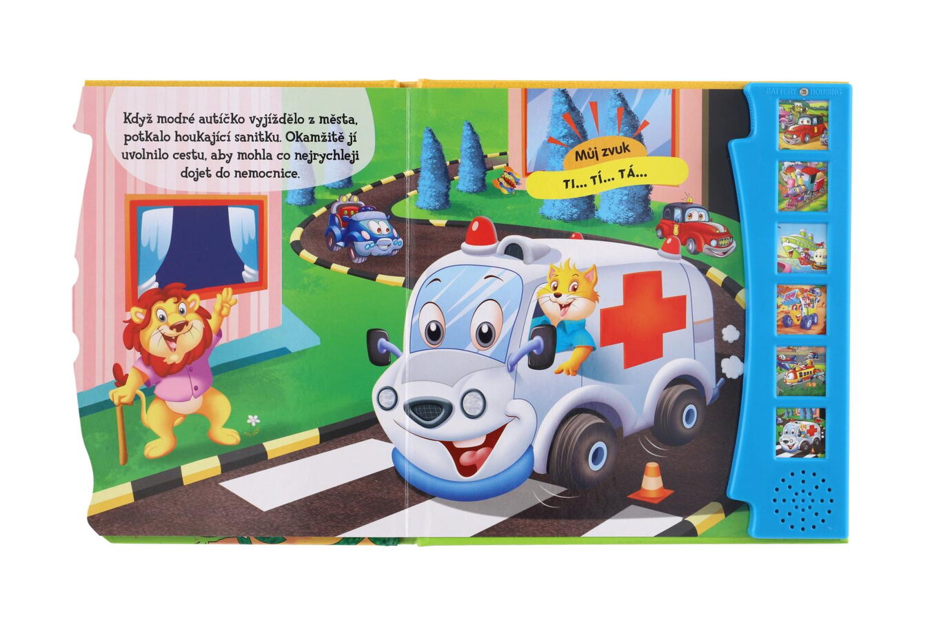 Zmáčkněte, prohlížejte obrázky a poslouchejte! Dětská kniha obsahuje krásné ilustrace, které zaujmou malé milovníky autíček. Stisknou tlačítko a mohou si poslechnout, jak dělají oblíbené dopravní prostředky, např. mašinka, parník, nakladač, sanitka...